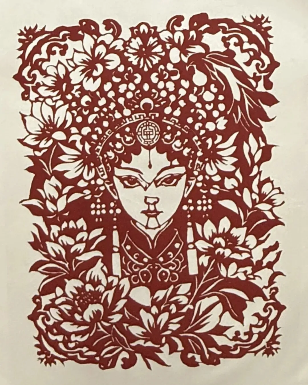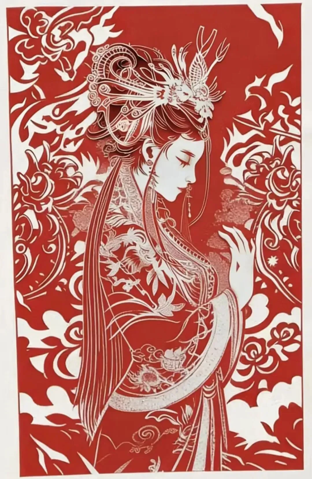 丹红裁作眉间色,素纸雕成鬓畔风。一纸一刃凝形影,红笺叠韵藏神容,刀剪勾勒风骨在,纸艺融情入画中。