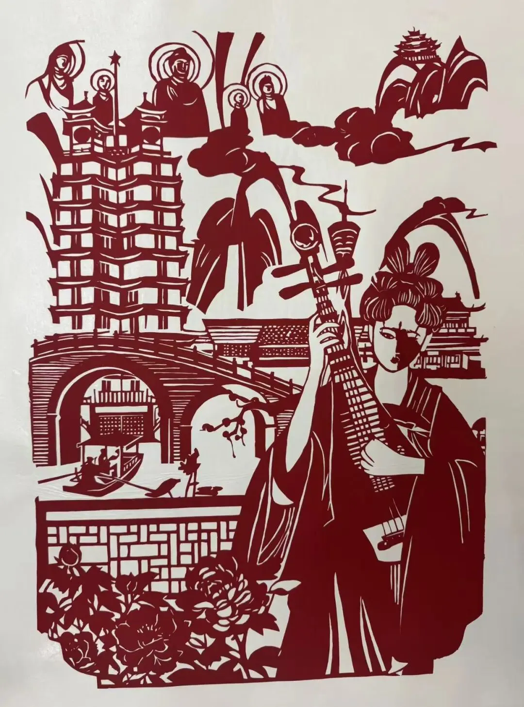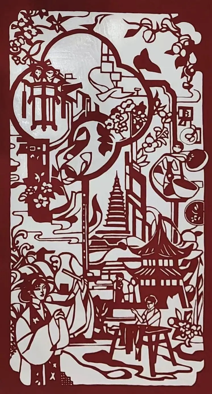 以剪纸这一传统民间艺术为载体,将弹琵琶的仕女与江南标志性的拱桥、佛塔、水乡建筑相融,线条的刻绘勾勒出江南的温婉意境,琵琶弦音似随剪纸的轮廓流淌,让视觉画面与听觉想象交织,诉说江南的诗意与柔情。