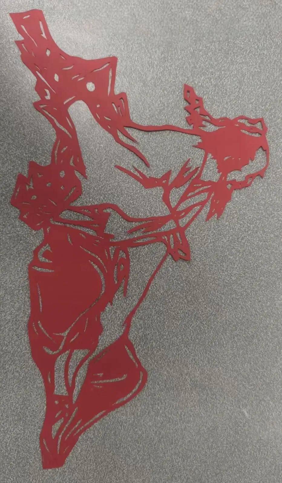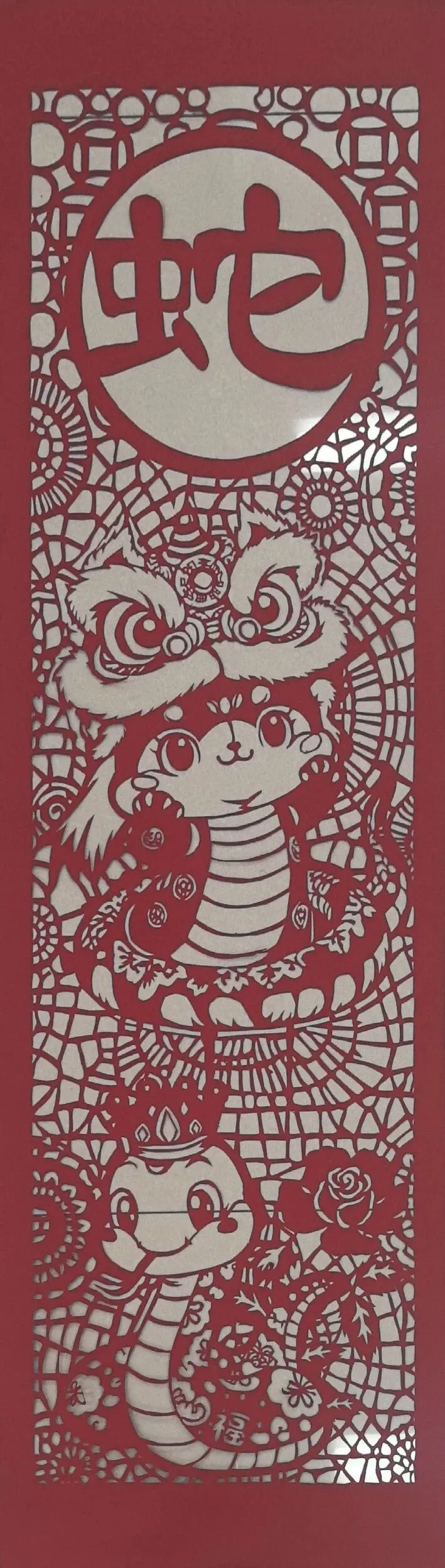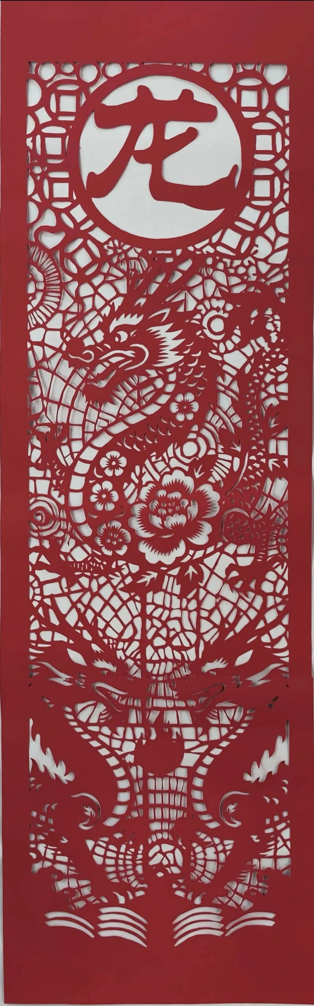 作品以红宣为材,采用镂空刻纸工艺塑造龙纹主题。细密纹路勾勒祥龙形态,融传统剪纸技法与生肖祥瑞寓意于一体,尽显民间工艺之巧。