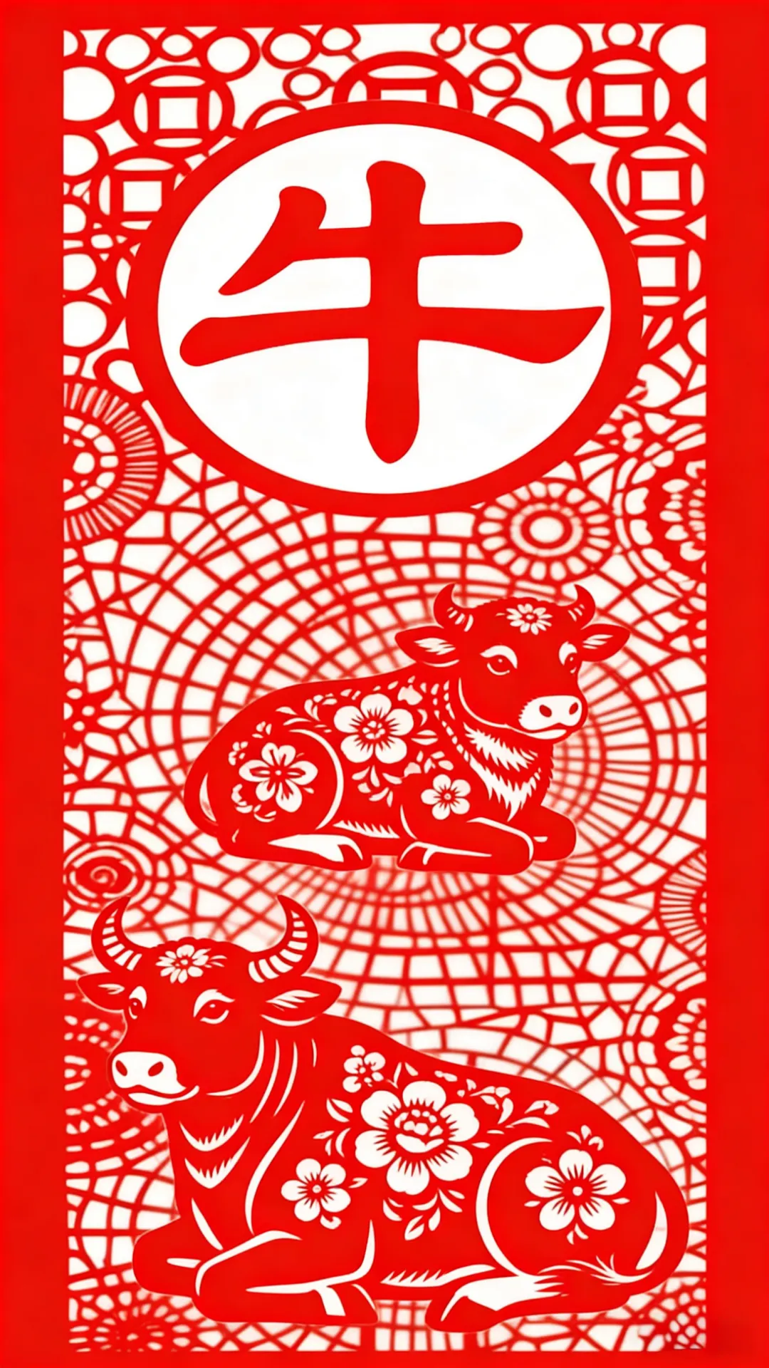 这幅生肖牛剪纸以红宣纸创作,竖版构图含“牛”字与双牛形象,饰花卉、铜钱纹,融阴阳刻技法,尽显剪纸巧思与纳福吉祥意。