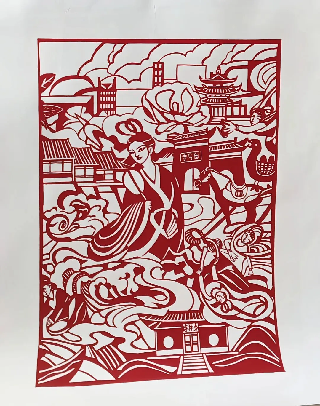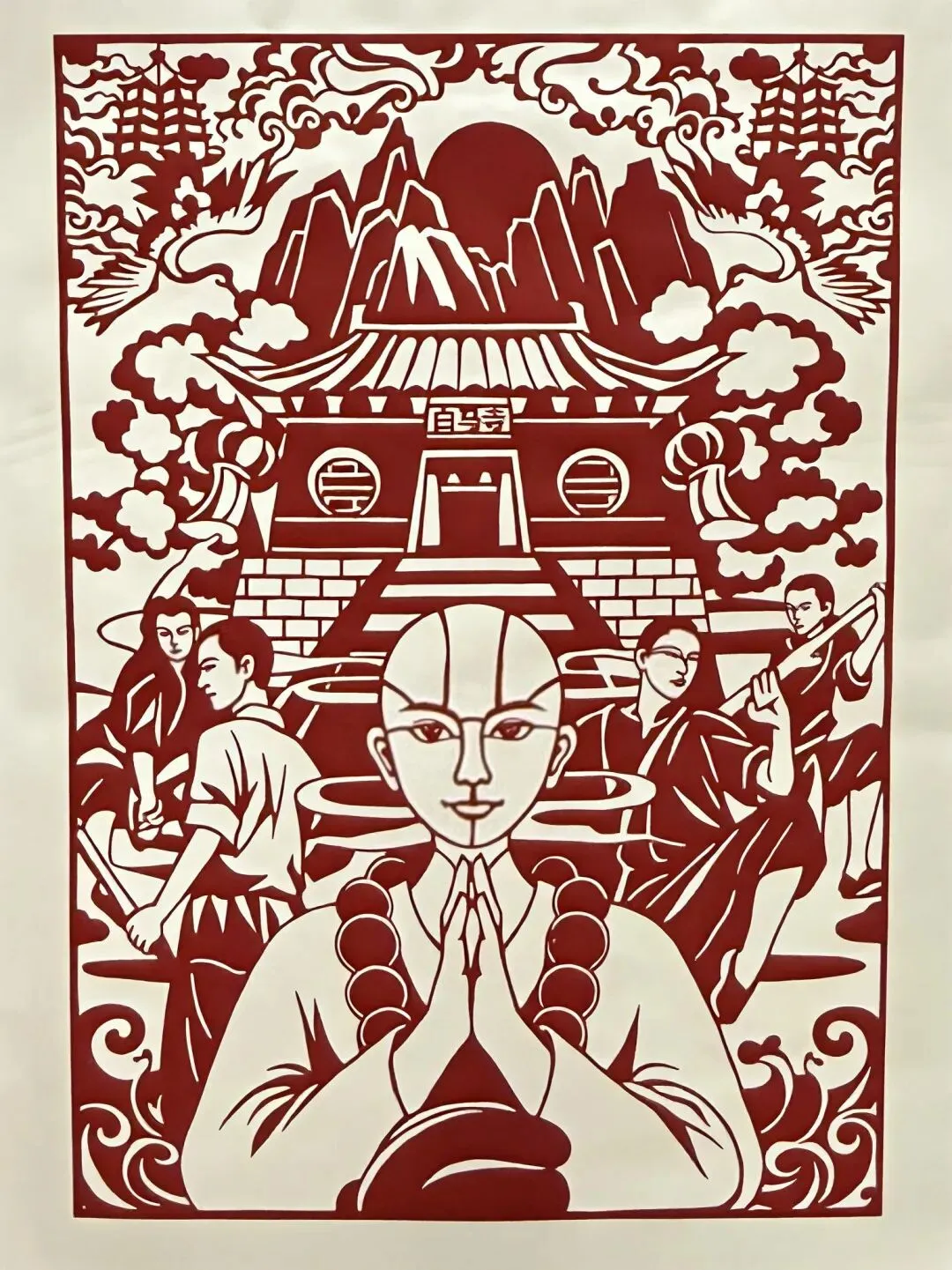 剪纸刻绘白马寺与禅者主体,辅以人物、云纹,以传统工艺凝练佛刹禅韵,尽显东方美学。