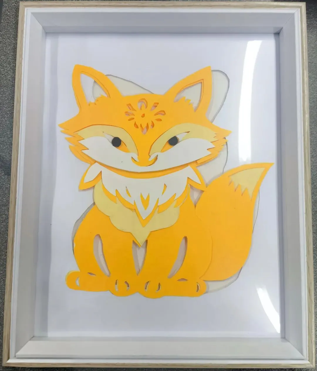 采用多层剪纸工艺塑造狐狸形象,以黄橙渐变卡纸分层叠加,雕琢毛发纹理与面部神态,借立体剪裁凸显灵动萌态,色彩层次丰富且细节鲜活。