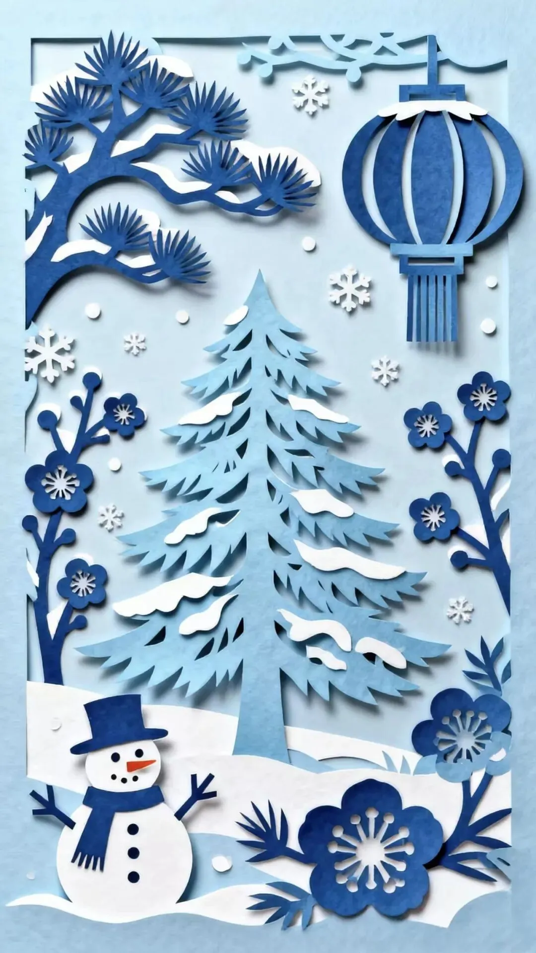 以蓝白剪纸绘寒枝覆雪之景,融松梅、雪境意象展冬日雅致与国风之美。
