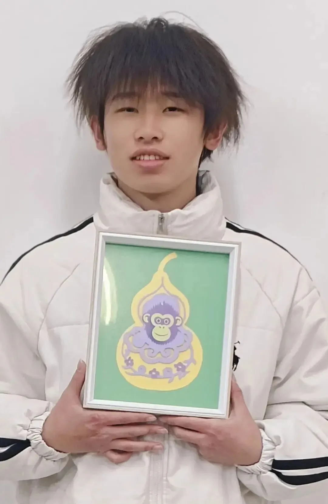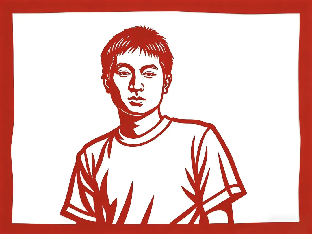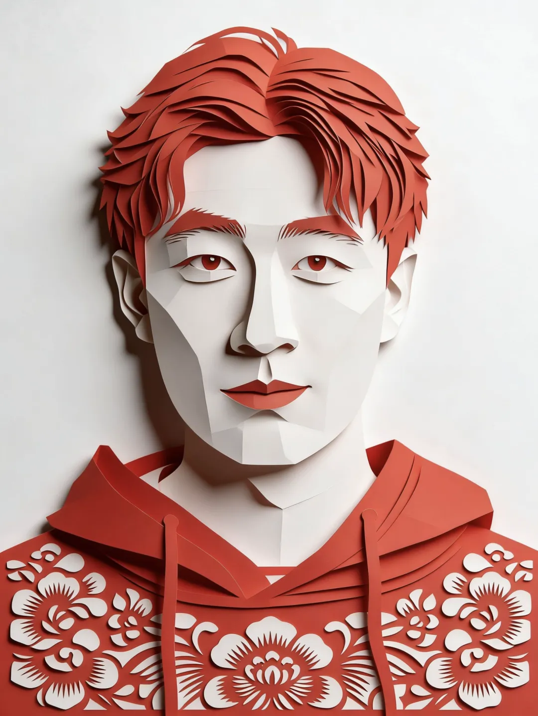 以红剪塑少年肖像,白衬红纹,显剪纸写实与青春质感。