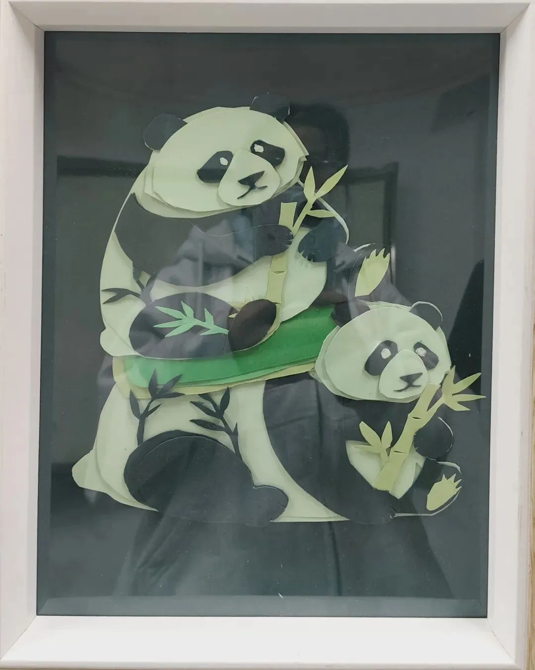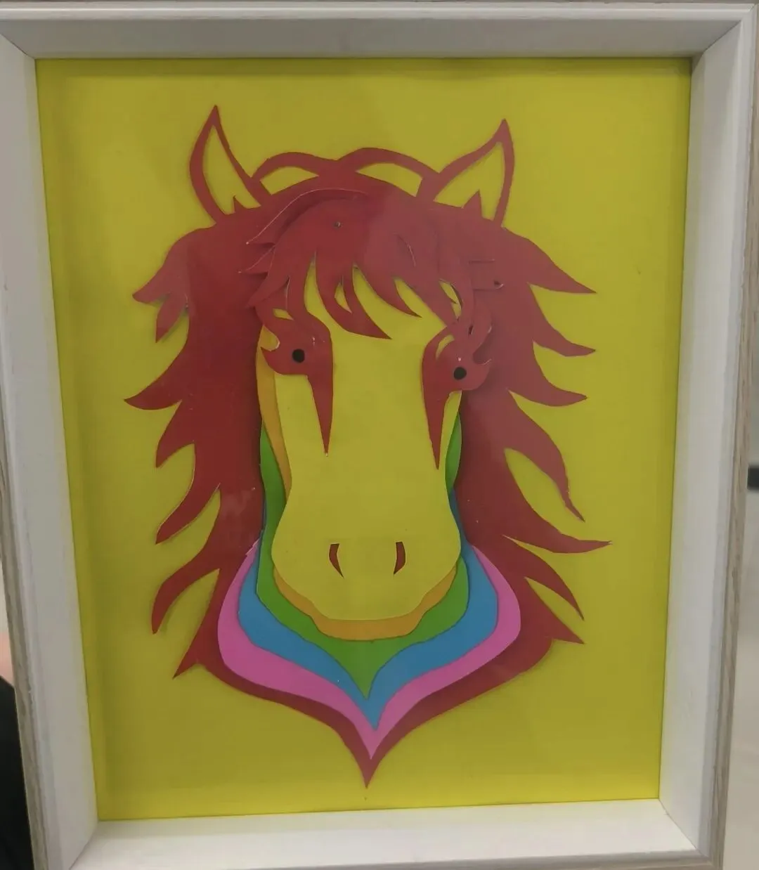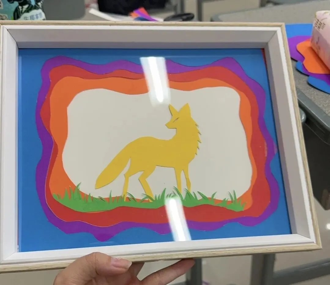 这幅拼贴画以明黄狐狸剪影为核心,搭配彩虹般层叠的彩框与青绿草地,用撞色的卡纸拼贴营造出童趣与梦幻感,狐狸昂首的姿态又添几分灵动与野趣。