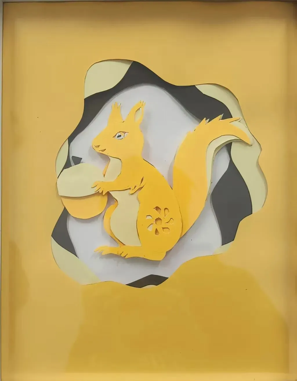 一纸剪刻,金栗松鼠跃然眼前,层叠造型鲜活,色彩搭配贴合意境,手作之美尽显。