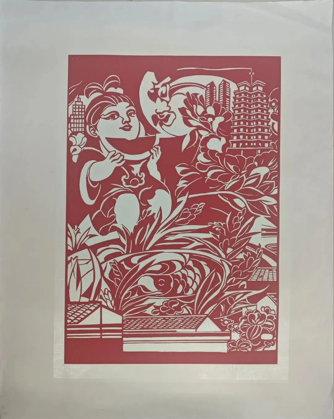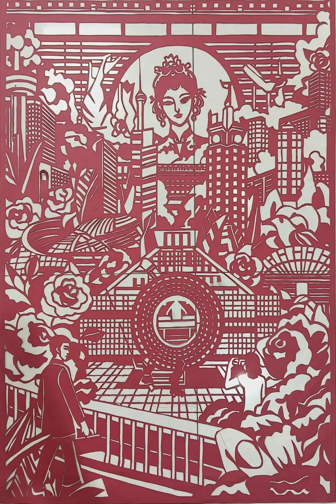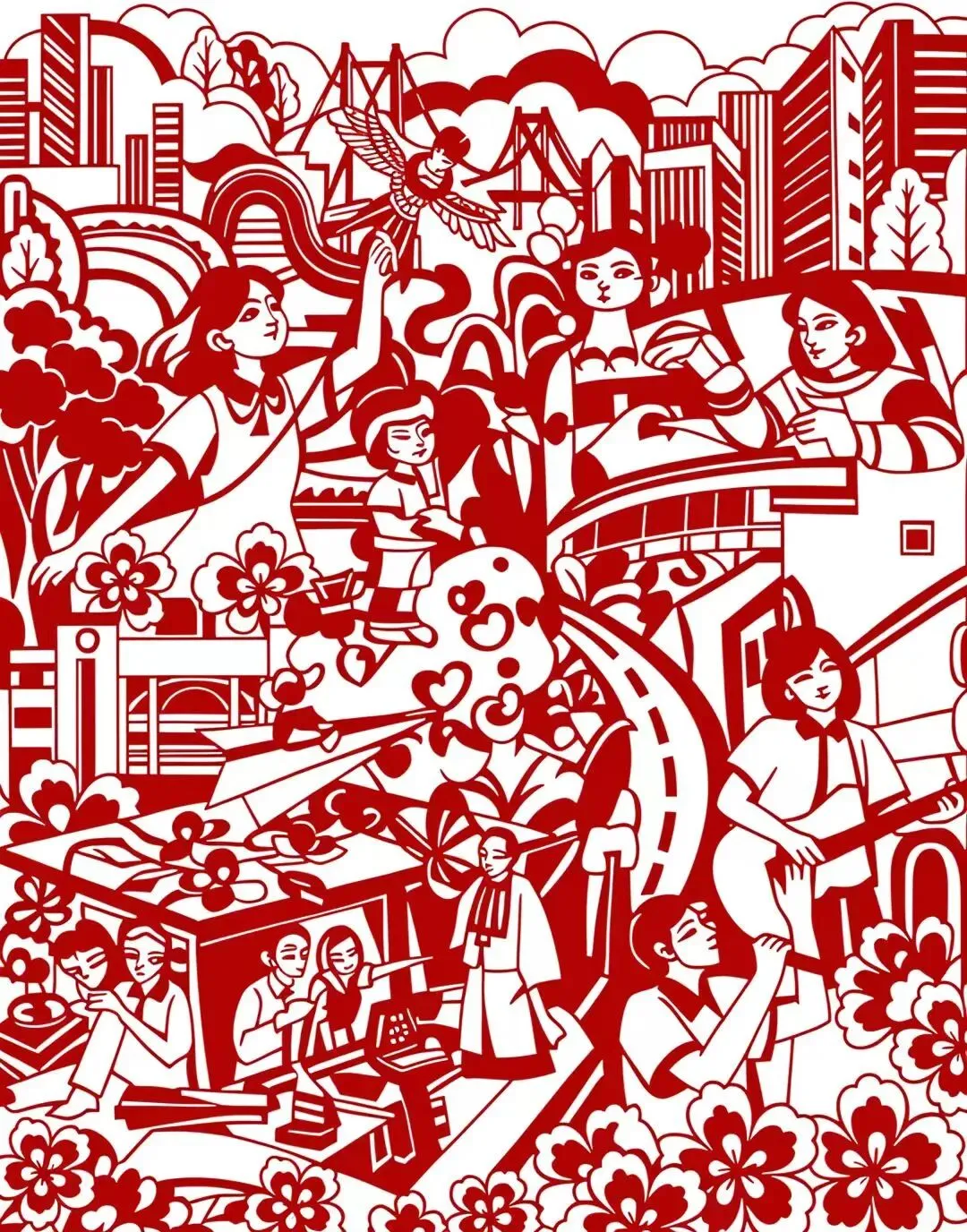 红纸勾勒出都市里的女性群像,她们或伏案工作、或执卷学习、或投身创造,高楼与繁花环绕身旁。传统剪纸的红,晕染着新时代女性的风采,一刀一线间,皆是女性在时代浪潮中绽放的光芒与力量。