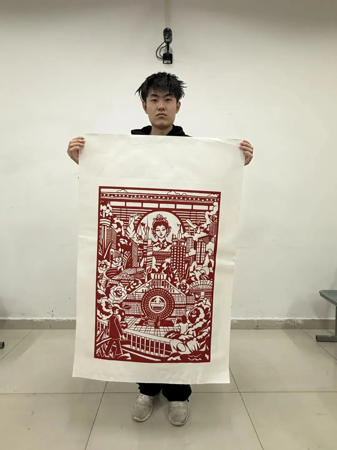 红纸剪刻出未来楼宇与航天轮廓,祥云绕着飞船舒展,锦鲤跃过星河浪纹。传统剪纸的红,晕染了科技的锋芒,古意的纹样与现代的线条交织,像是在诉说,千年的东方浪漫,正乘着火箭奔向星海。‘