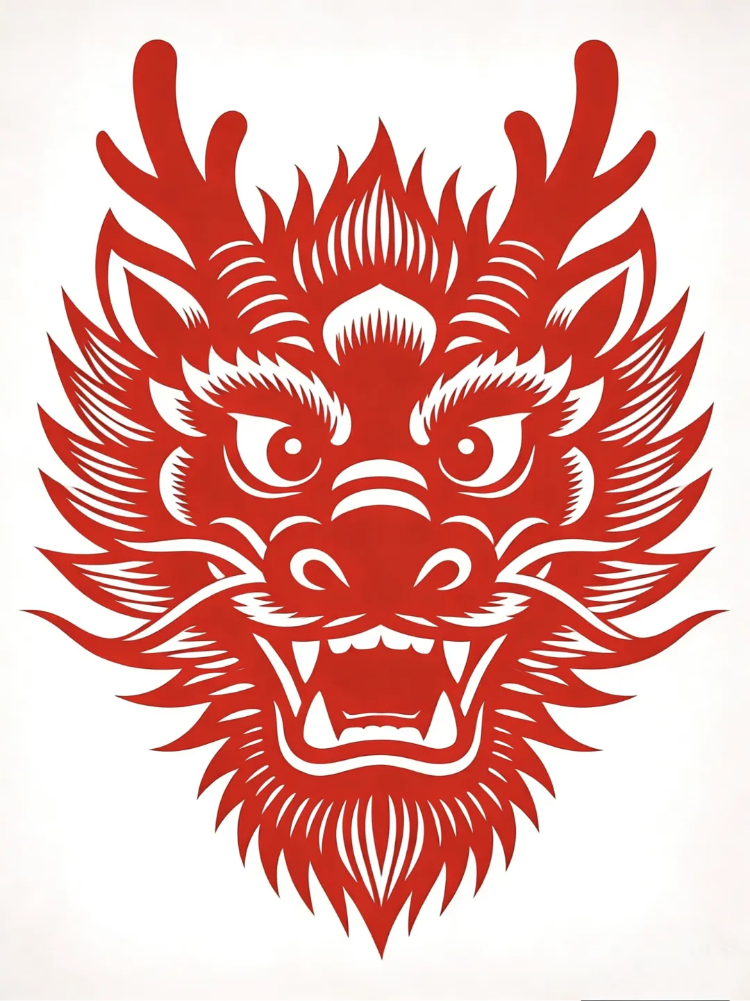 为红色剪纸作品,以剪刻工艺塑龙头正面像,白背景衬红剪纹样,尽显剪纸镂空美与龙的威仪。