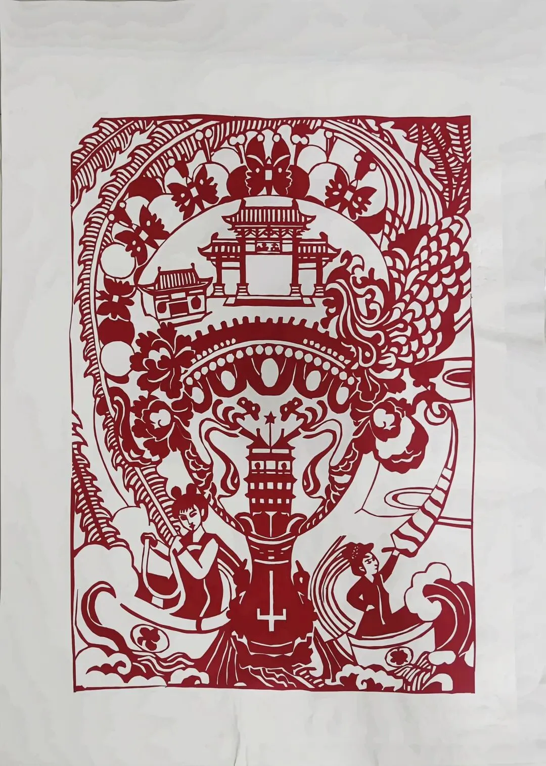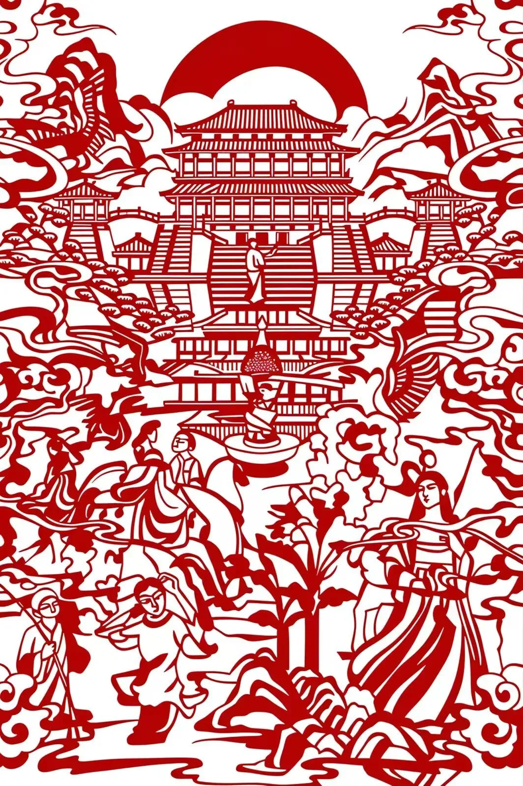 红纸刀锋雕琢出古楼飞檐,祥云缠绕着亭台,文人雅士聚于楼前吟诗作赋。传统剪纸的线条勾勒出千年文脉的气韵,一剪一凿间,仿佛能听见古卷里的吟诵声,顺着红纸上的纹路,飘向岁月深处。