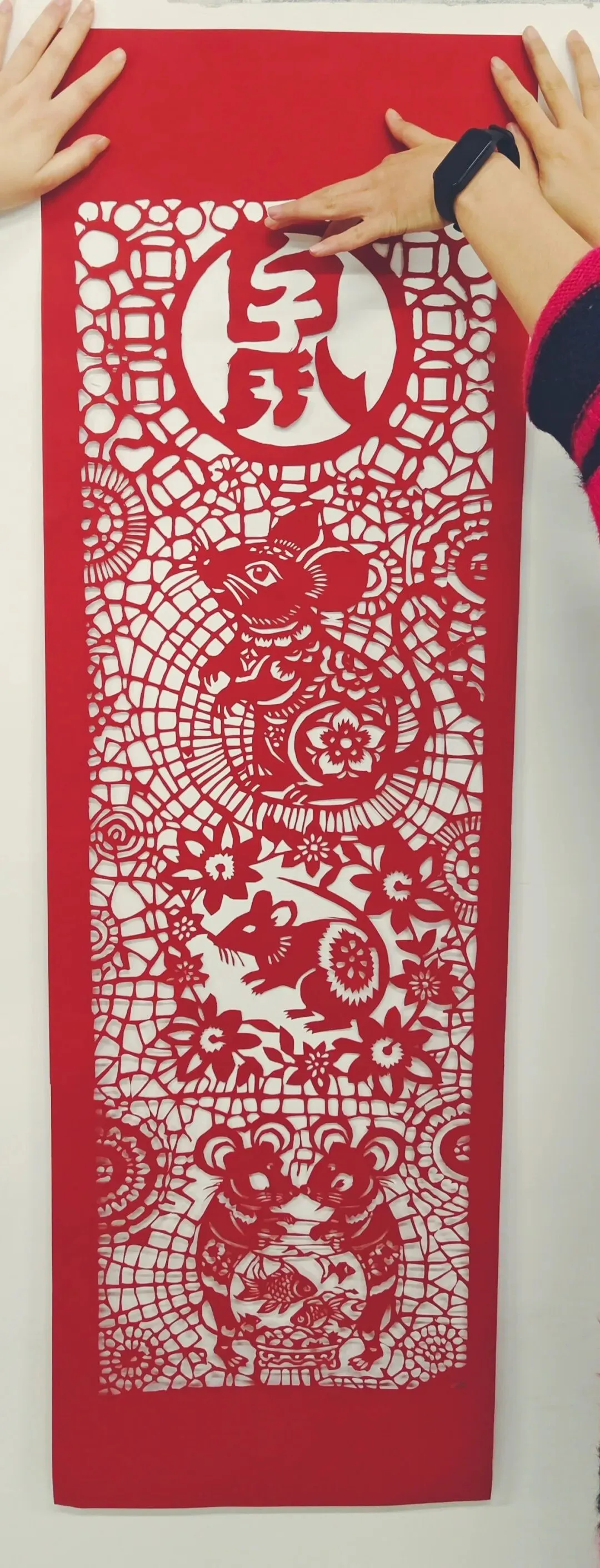 此作以红剪镂刻鼠纹与繁花,福字居上成视觉核心,碎纹底衬增层次感,融民俗吉祥意与剪纸镂空美于一体。