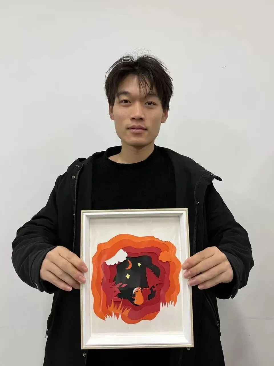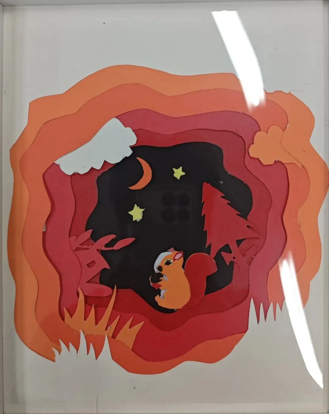 作品将秋日的暖艳与夜晚的静谧融合,立体的纸艺让画面富有呼吸感,小动物的形象则赋予作品温馨、治愈的情感基调。