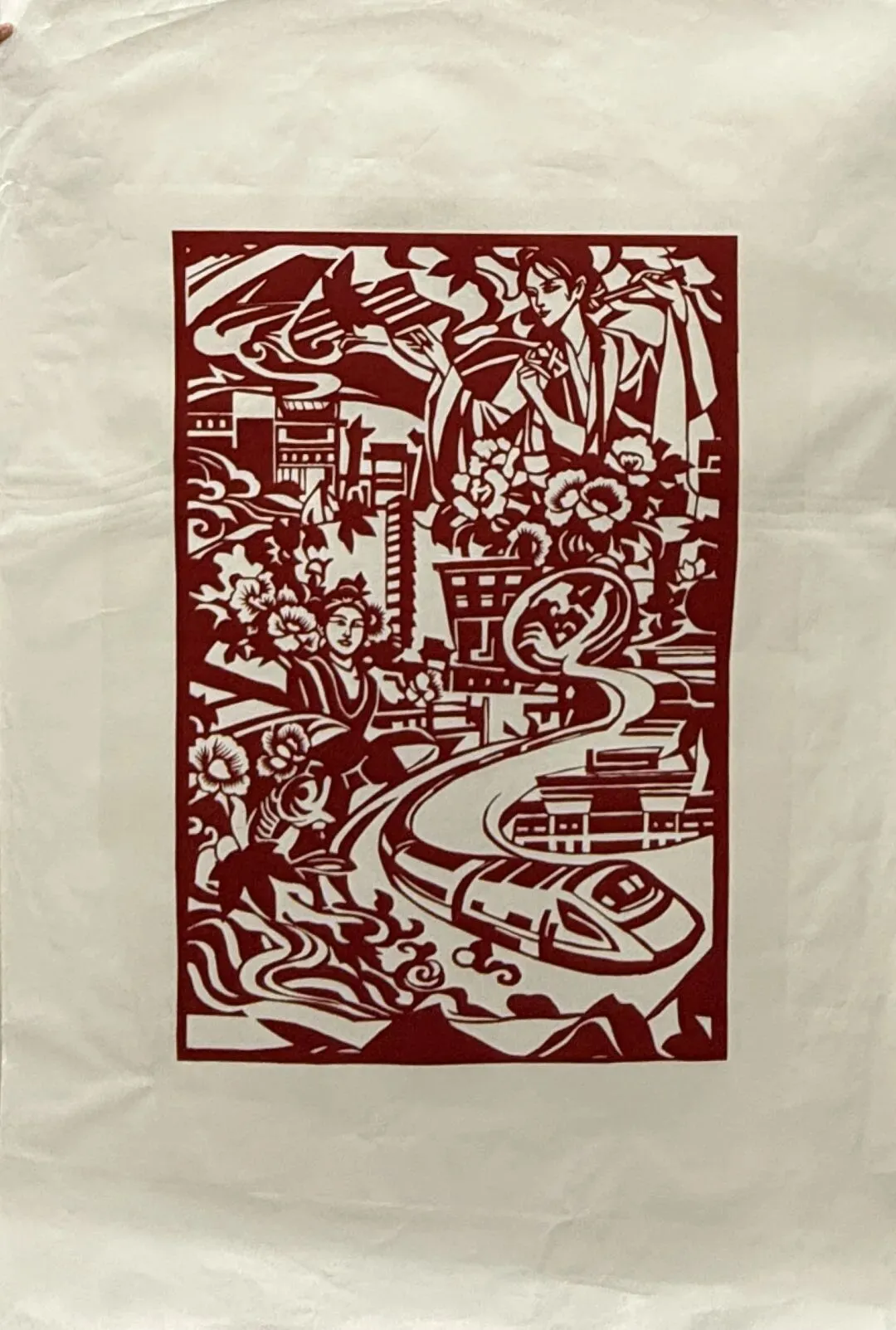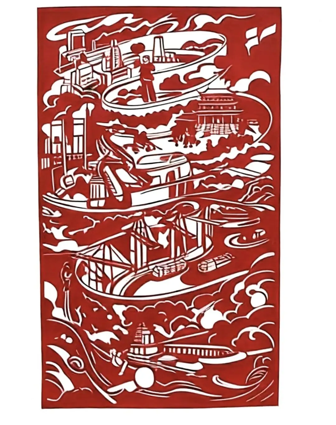 剪纸以传统符号融合现代元素,借天坛、高铁等意象颂祖国文脉传承、科技腾飞的盛世气象。
