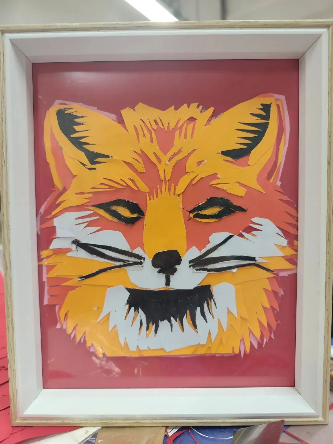 1. 毛发分层:以橙色、黄色、红色等不同色调的剪纸层叠,模拟狐狸皮毛的蓬松质感,从浅橙的绒毛到深橙的外层毛发形成视觉层次;2. 面部特征:刻画了狐狸的眼睛、鼻子、嘴巴与胡须,通过镂空和层叠工艺突出面部的立体感;3. 色彩搭配:以红色为底色,搭配橙、黄、黑等色彩的剪纸层,强化狐狸头部的视觉冲击力与艺术表现力。作品