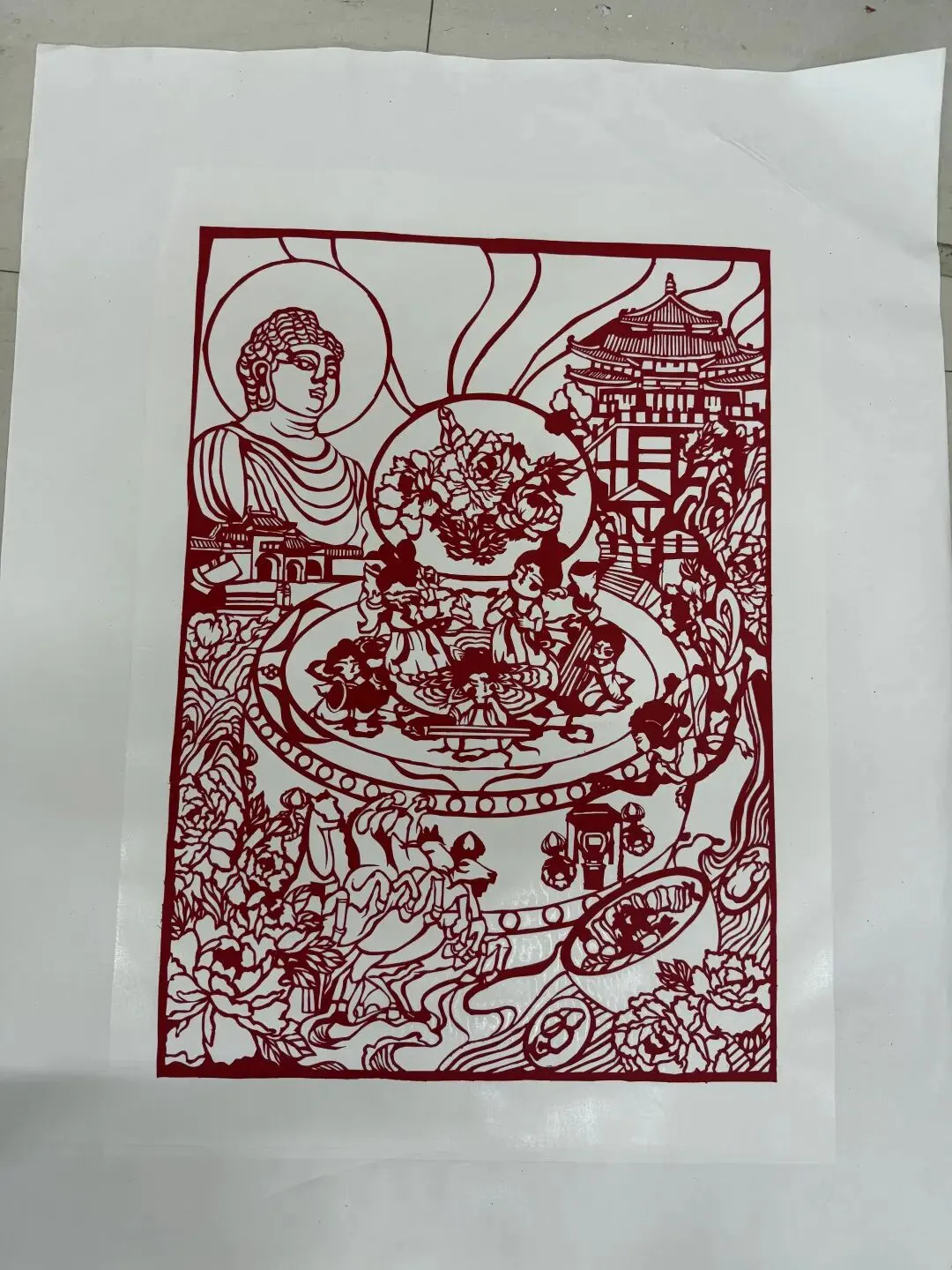 以剪纸工艺勾勒佛造像与仙宴盛景,借红底白宣的传统形式,融合佛教意境与仙俗欢筵的画面层次。