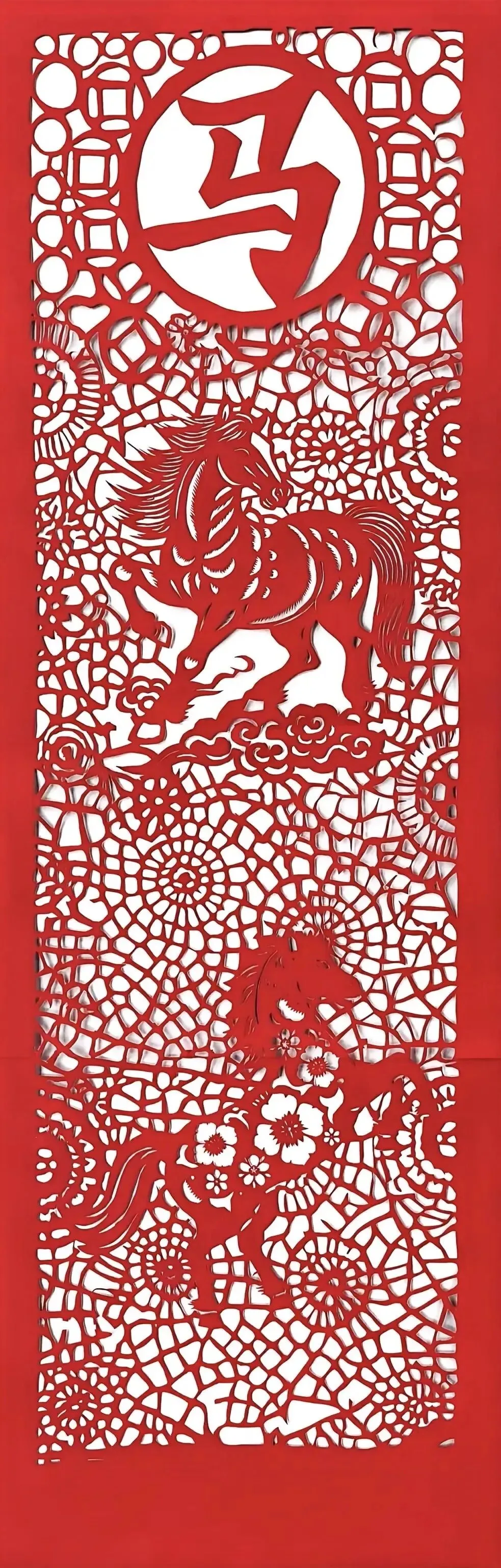 朱红纸纹缠瑞马,剪锋刻出奔腾姿,一笔一刃藏龙马精神。