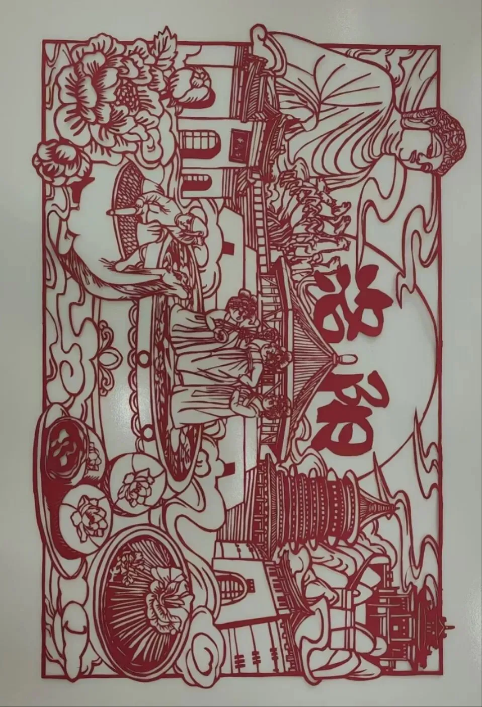 洛阳的佛教文化代表古建筑,还有牡丹这一洛阳市花的纹样;画面中“洛阳”二字醒目,搭配祥云、人物等装饰元素,整体剪纸工艺细腻,把洛阳的历史底蕴与地域特色具象化呈现。