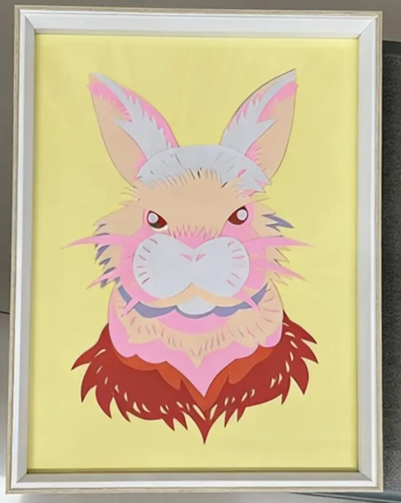 彩笺层剪塑锦兔,粉黄相映绽华光。细纹绕身凝匠意,祥韵满盈,愿福运常伴,喜乐安康。