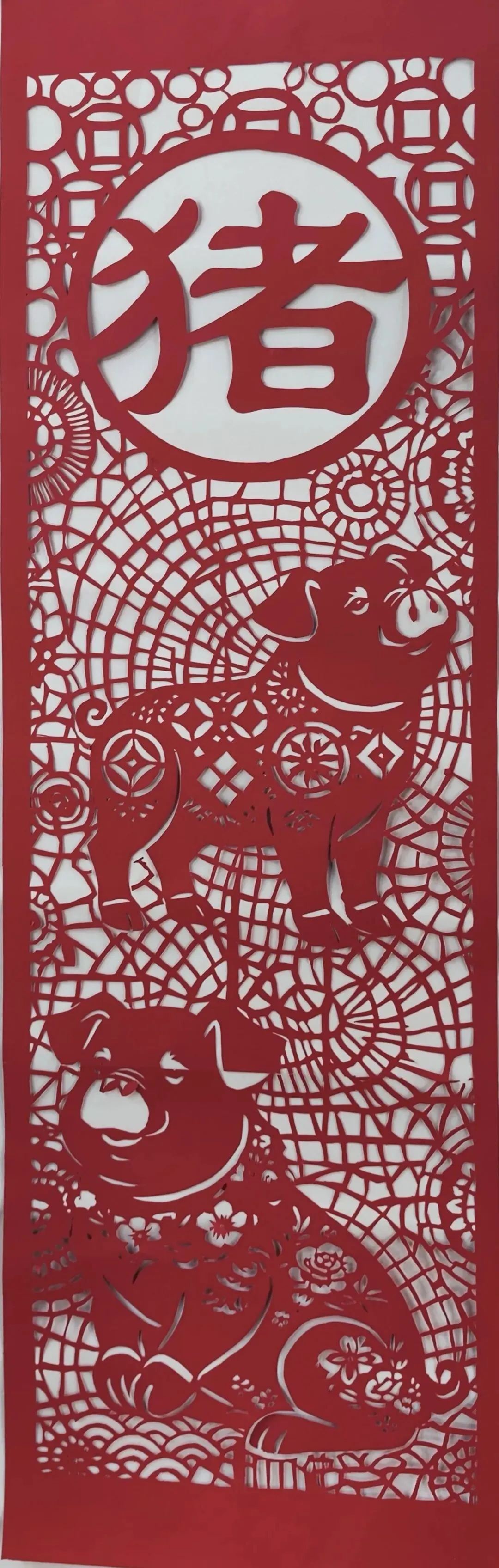 红剪雕出亥猪迎吉图,圆纹环“猪”字显灵动,憨猪造型藏祥瑞。细缕纹络凝匠艺,纳吉迎祥寄新春美好期许。