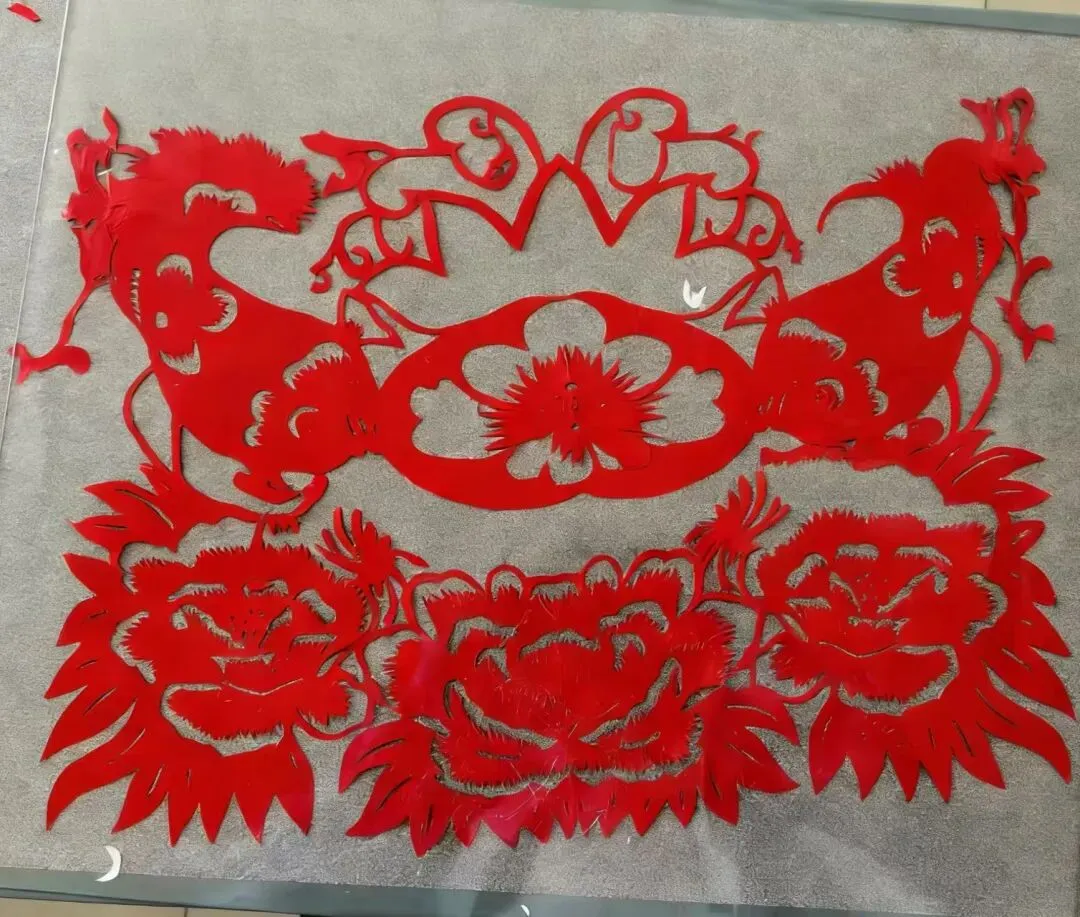 朱红剪纸裁出麟兽的矫健与牡丹的雍容,瑞兽的爪牙轻绕花枝,花瓣的纹路在刀锋下舒展。红纸上的纹样缠缠绕绕,似将新春的福气与花开的盛景揉在一起,藏着剪纸人对岁岁平安的温柔期盼。