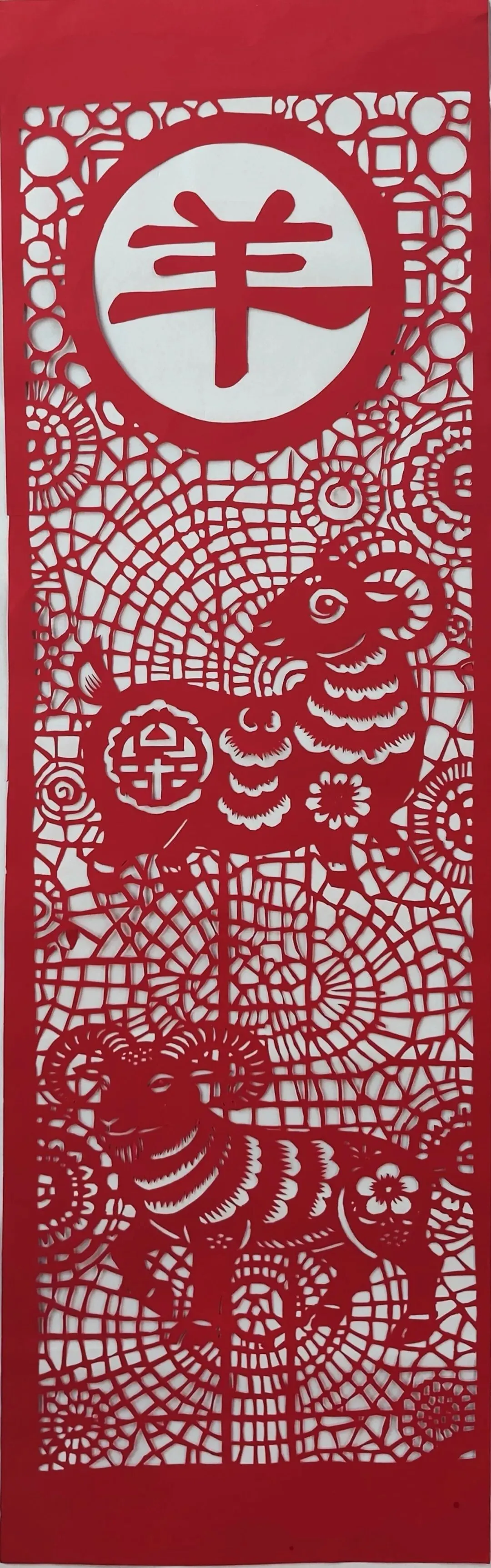 层叠的镂空纹如锦缎交织,生肖羊字居于圆中,传统剪纸技法将祥羊纳福的美好祈愿凝于尺幅。