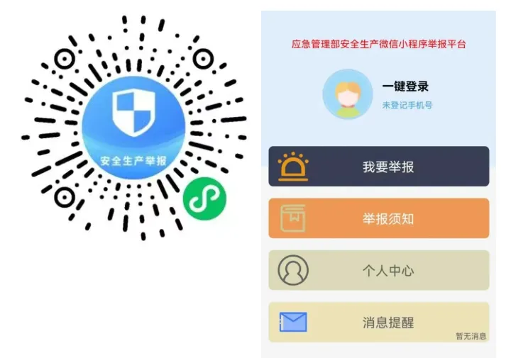 群众参与安全生产社会监督对查找重大事故隐患和打击非法违法行为发挥重要作用,发现重大事故隐患和安全生产违法行为可以通过以下方式第一时间举报。方法一:扫描下方“应急管理部安全生产举报”微信小程序二维码,点击【一键登录】登记手机,点击【我要举报】阅读举报须知后进入信息填写页面,即可填写举报内容,在【个人中心】可以查看举报记录和受理情况。
