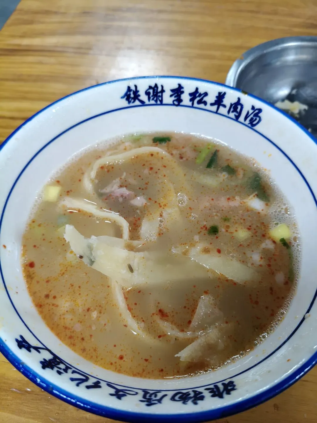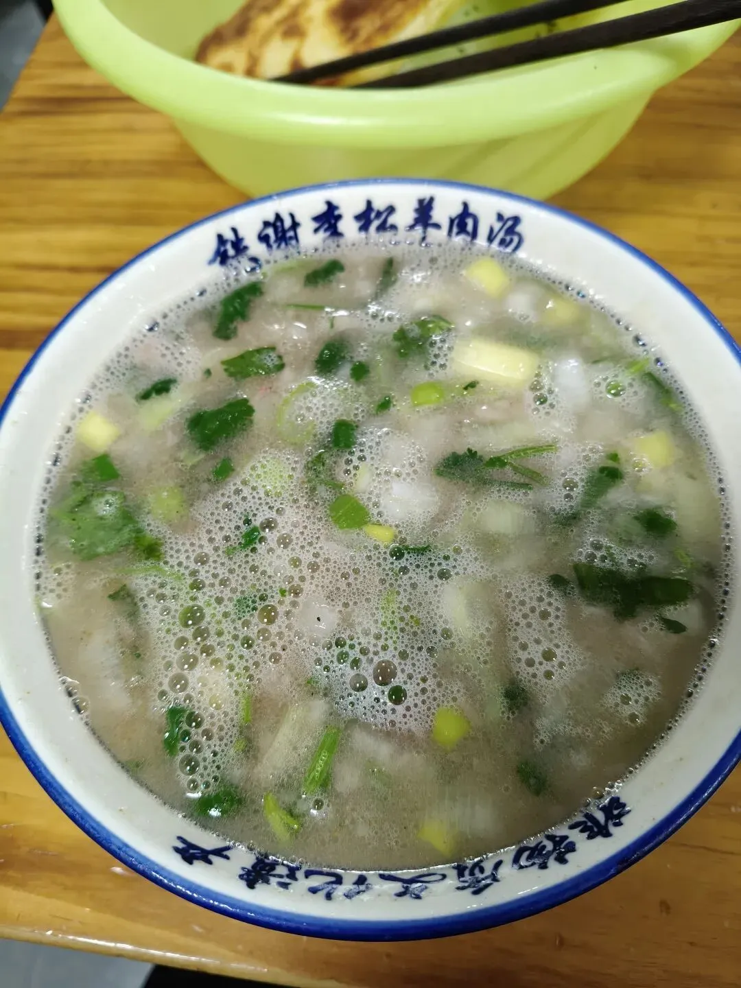 饼是分开买的,如果比较大的店可能是分开的,小店打汤时就买了,不绝对。一个饼,这么大个盆显得比较能吃,这种饼比较干,有人喜欢翠翠的感觉,各有所爱吧。