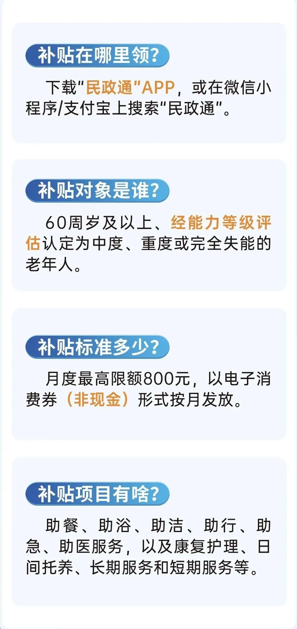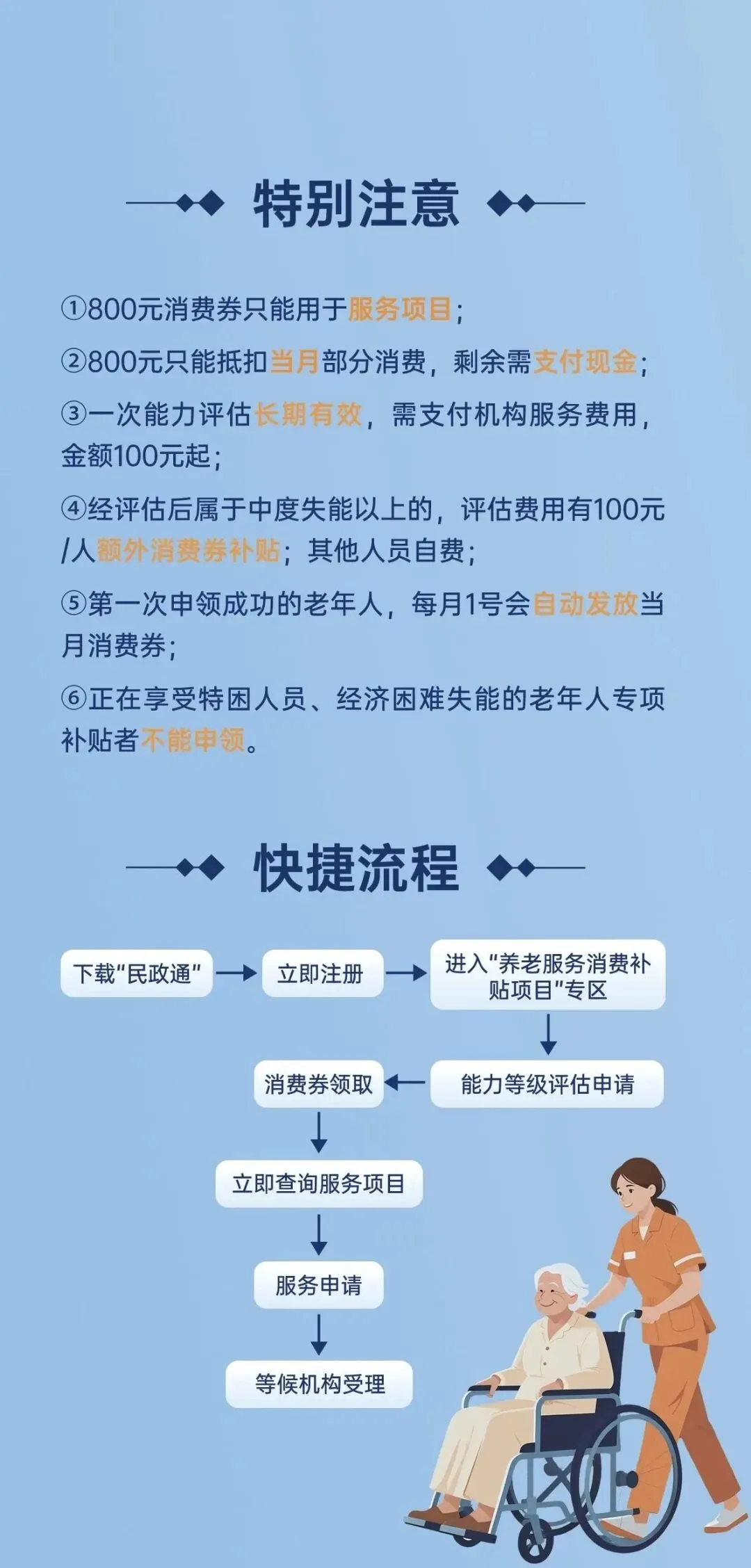 申领流程主要分为三步:首先,家属或代办人通过“民政通”小程序为老人注册并提交评估申请;其次,由专业评估人员上门进行能力评估,该环节为决定是否符合条件的关键;最后,评估达标后,系统将自动发放消费券,此后每月1日自动到账,无须重复申请。