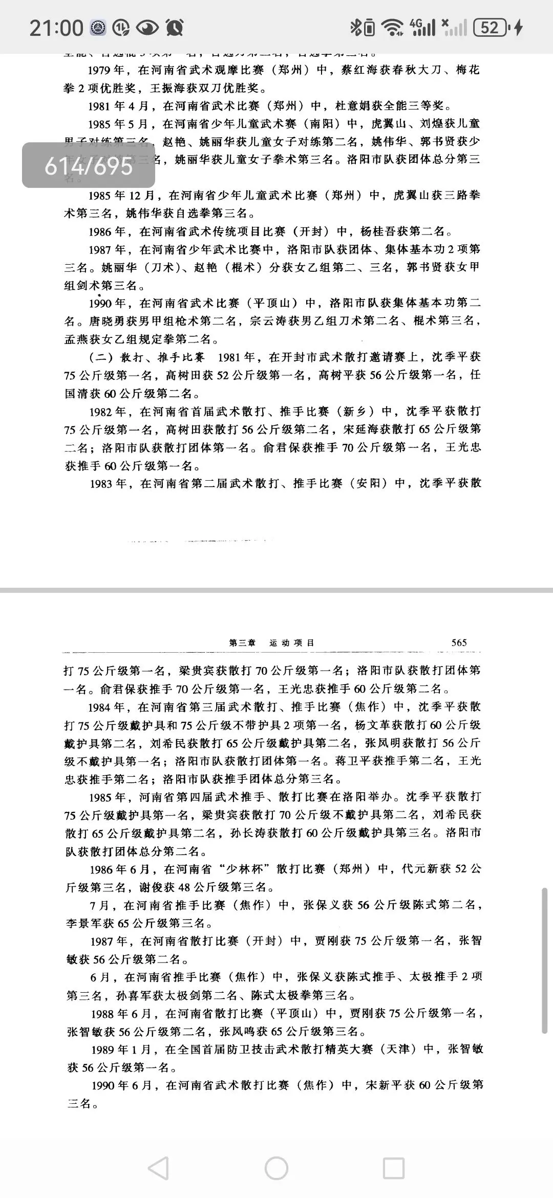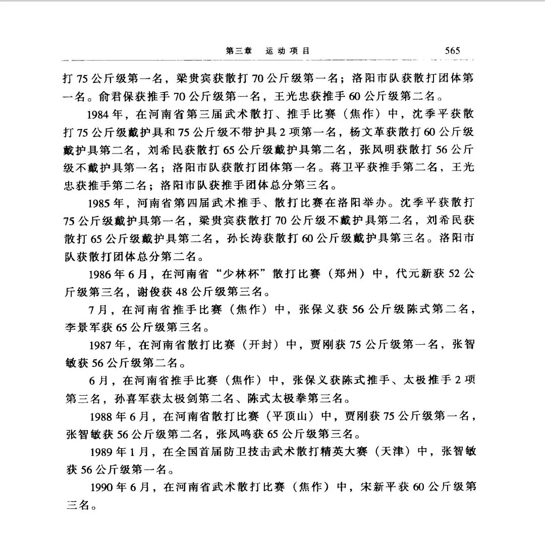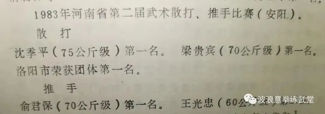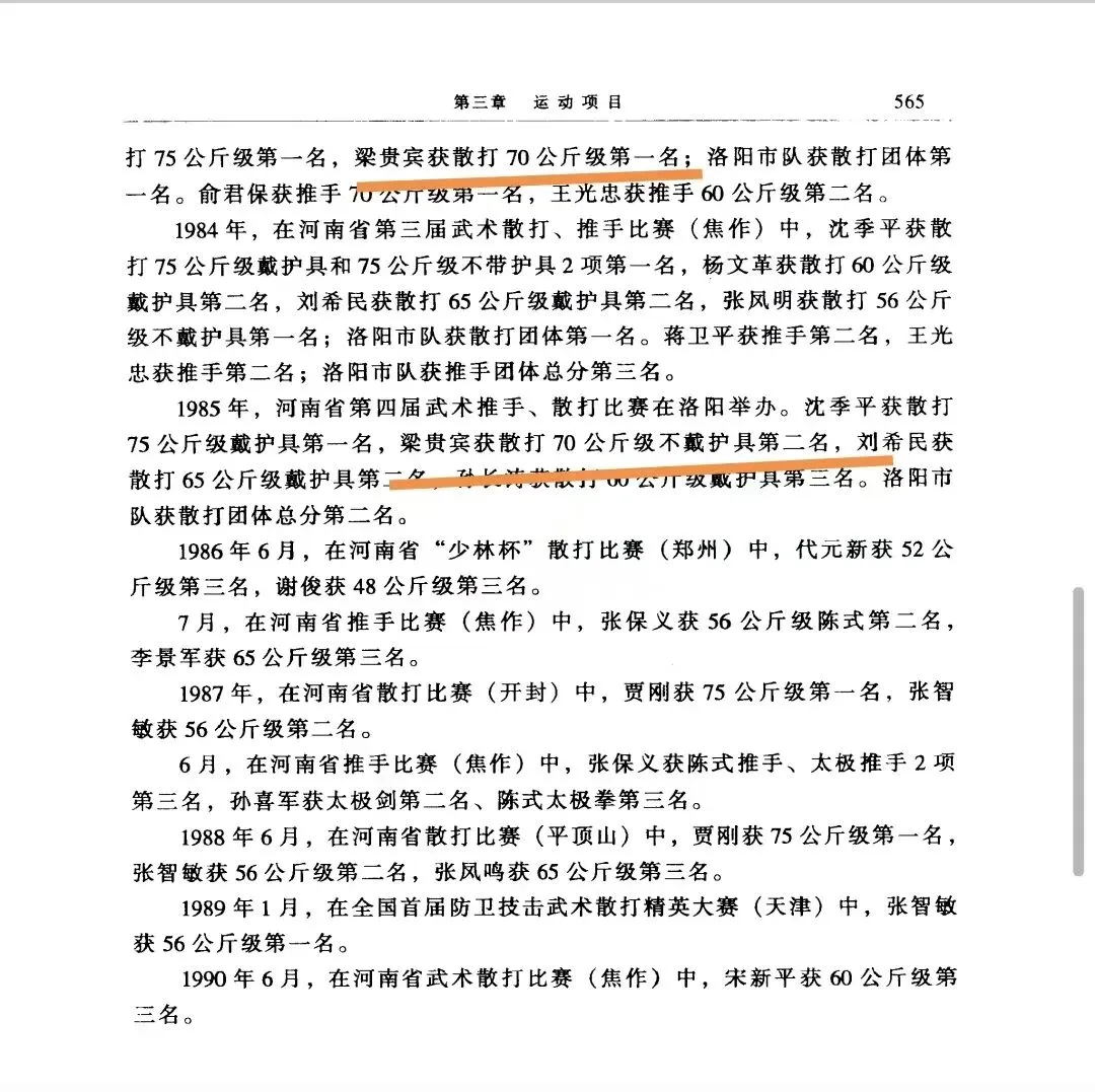 洛阳体育志官方比赛成绩造假,有必要再澄清一下。梁贵斌师伯82到85连续四届获得五个冠军(85一届越级别拿了两个冠军70公斤级,75公斤级,75公斤级当时决赛只有三个人,梁师伯,沈季平,姚国富),但洛阳体育志上只记载两次成绩82年,85年。85年不提两个冠军,篡改成第二名。幸好梁师伯家里保留当年的报纸和奖状记录。[合十][愉快]