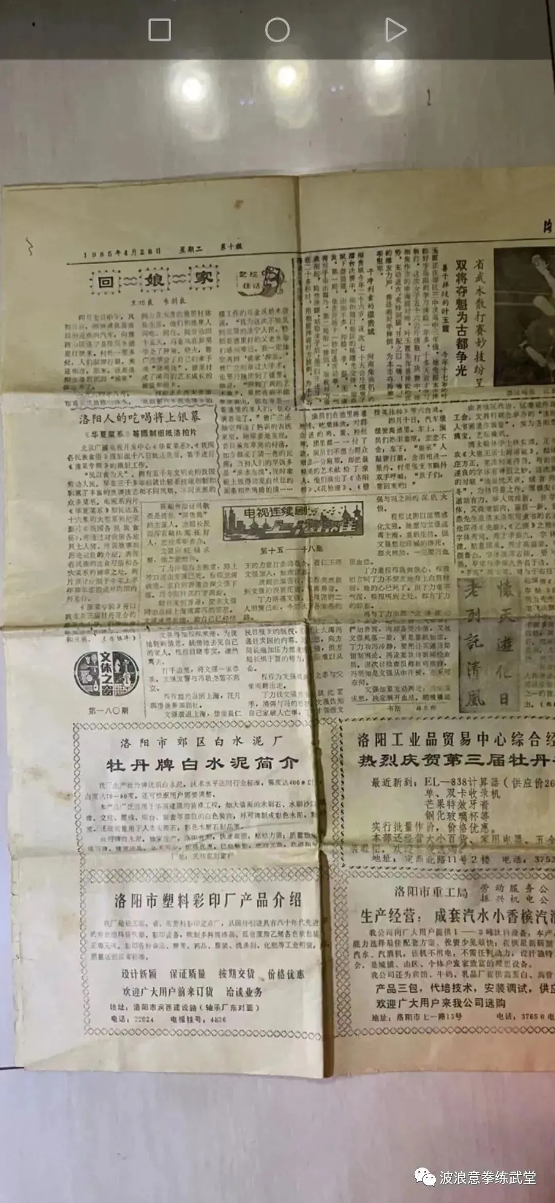 洛阳日报,1985年4月28日对比赛的报道,及奖状明确记录1985年。洛阳日报报道过好几次,奖状也好几张。目前师伯家里只保留了这张报纸及奖状。