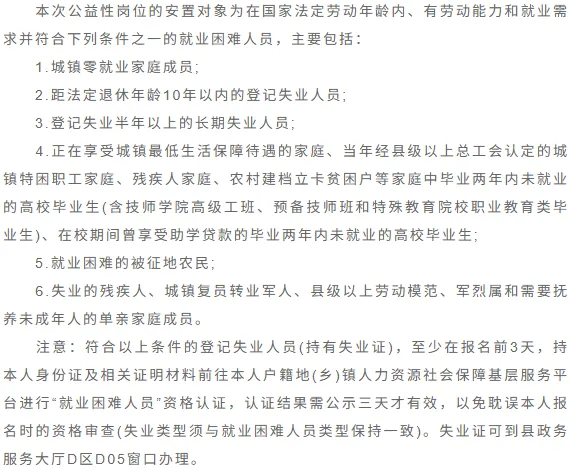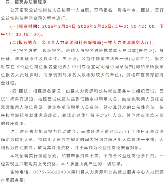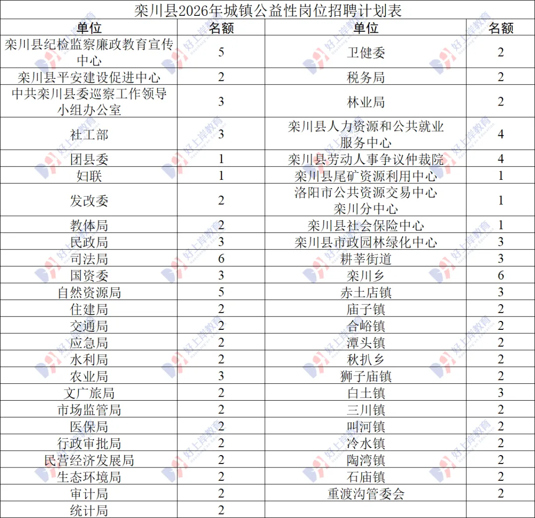 为促进就业困难人员就业,搭建供需双方对接平台,根据《河南省人力资源和社会保障厅河南省财政厅关于印发河南省公益性岗位管理办法的通知》(豫人社办〔2020〕23号)、《洛阳市公益性岗位开发管理实施细则》(洛人社〔2020〕25号)及《洛阳市人力资源和社会保障局关于确定洛阳市2026年城镇公益性岗位开发计划的通知》(洛人社就业〔2026〕1号)文件精神,现将栾川县公益性岗位招聘有关事宜公告如下: