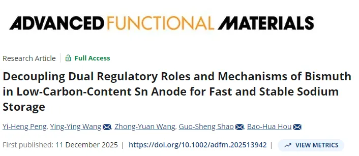 该研究通过引入铋元素,成功构建了具有超低碳含量的锡基合金负极材料,并深入解析了铋在材料制备与电化学过程中的双重调控机制。研究表明,铋不仅通过形成强化学键和异质结构有效解决了退火过程中活性材料的结构失控问题,更通过独特的原位纳米化机制逆转了循环过程中的颗粒团聚现象,显著提升了材料的结构稳定性和反应动力学。Sn/Bi@C复合材料在保持高达88.9%活性组分含量的同时,实现了优异的倍率性能和超长循环寿命,为设计高能量密度钠离子电池提供了有效的材料解决方案。该工作所提出的双金属纠缠演化策略及相关机理认识,对于指导高性能低碳含量合金型负极材料的理性设计具有重要的科学意义和应用价值,为推动钠离子电池的商业化进程提供了新的技术路径。