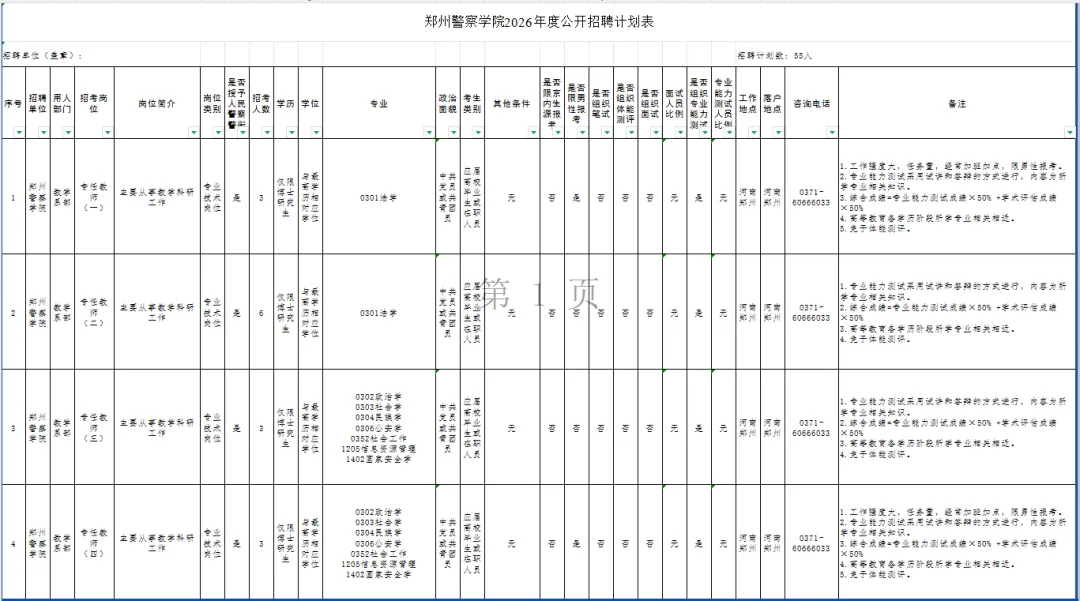 本次招聘共设置19个职位、拟招聘55人,均为学院在编人民警察。具体职位信息及资格条件详见《郑州警察学院2026年度公开招聘计划表》(见附件)。