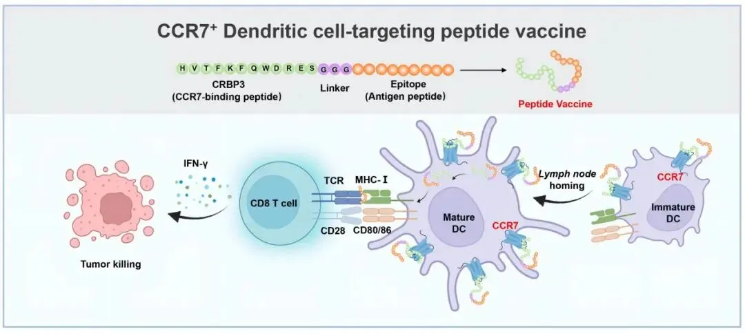 肿瘤多肽疫苗临床应用的最大问题是疫苗的靶向性以及体内激活CD8+T细胞的效果不佳,这也是绝大多数肿瘤多肽疫苗临床失败的主要原因。为了解决这一问题,通过表面受体特异性靶向专职性抗原提呈细胞—树突状细胞是一种有前景的策略。CCR7,一种趋化因子受体,在树突状细胞的迁移和淋巴结归巢中发挥着至关重要的作用,成为开发靶向树突状细胞免疫疗法的理想靶点。