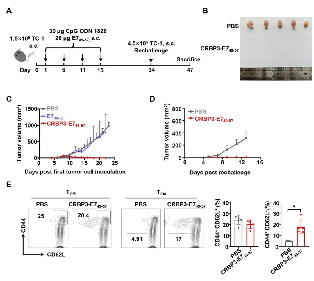 在本研究中,通过噬菌体展示肽库技术和亲和实验,课题组筛选获得一条能够特异性靶向CCR7的多肽CRBP3。在体外实验中,CRBP3能够高效亲和及被未成熟和成熟的树突状细胞内吞。在小鼠足垫部位注射后,CRBP3能够有效积聚到腘窝淋巴结中。当CRBP3与抗原表位肽OVA257-264偶联时,无论树突状细胞是否成熟,偶联肽疫苗(CRBP3-OVA257-264)均能显著增强树突状细胞表面的第一信号—抗原肽/ MHC-I复合物的形成,并显著促进抗原特异性CD8+T细胞的增殖以及IFN-γ+CD8+T细胞的比例。体内抗肿瘤活性实验结果显示,CRBP3与外源性抗原肽OVA257-264和内源性抗原肽HPV16 E749-57偶联后,分别在抗PD-1响应性的B16-OVA小鼠模型和抗PD-1不响应的TC-1肿瘤模型中展现出显著的抗肿瘤免疫应答。值得注意的是,CRBP3-E749-57偶联肽疫苗在TC-1肿瘤模型中诱导了肿瘤的完全消退,并且在三倍荷瘤细胞的再挑战时仍能提供持久的保护,抑制肿瘤的发生。