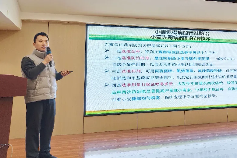 培训会上,省农科院的资深专家李向东、徐飞就小麦田间管理和病虫害科学防控进行了深入浅出的专题授课。针对当地小麦晚播、苗情偏弱的实际情况,专家们详细阐述了春季中耕镇压、科学浇水追肥等促弱转壮的关键技术,并深入解读了茎基腐病、根腐病等晚播小麦易发病害,以及猪殃殃、野燕麦等常见草害的精准防控策略。同时,针对春季可能遭遇的春旱、“倒春寒”等自然灾害,也给出了切实可行的防范措施。