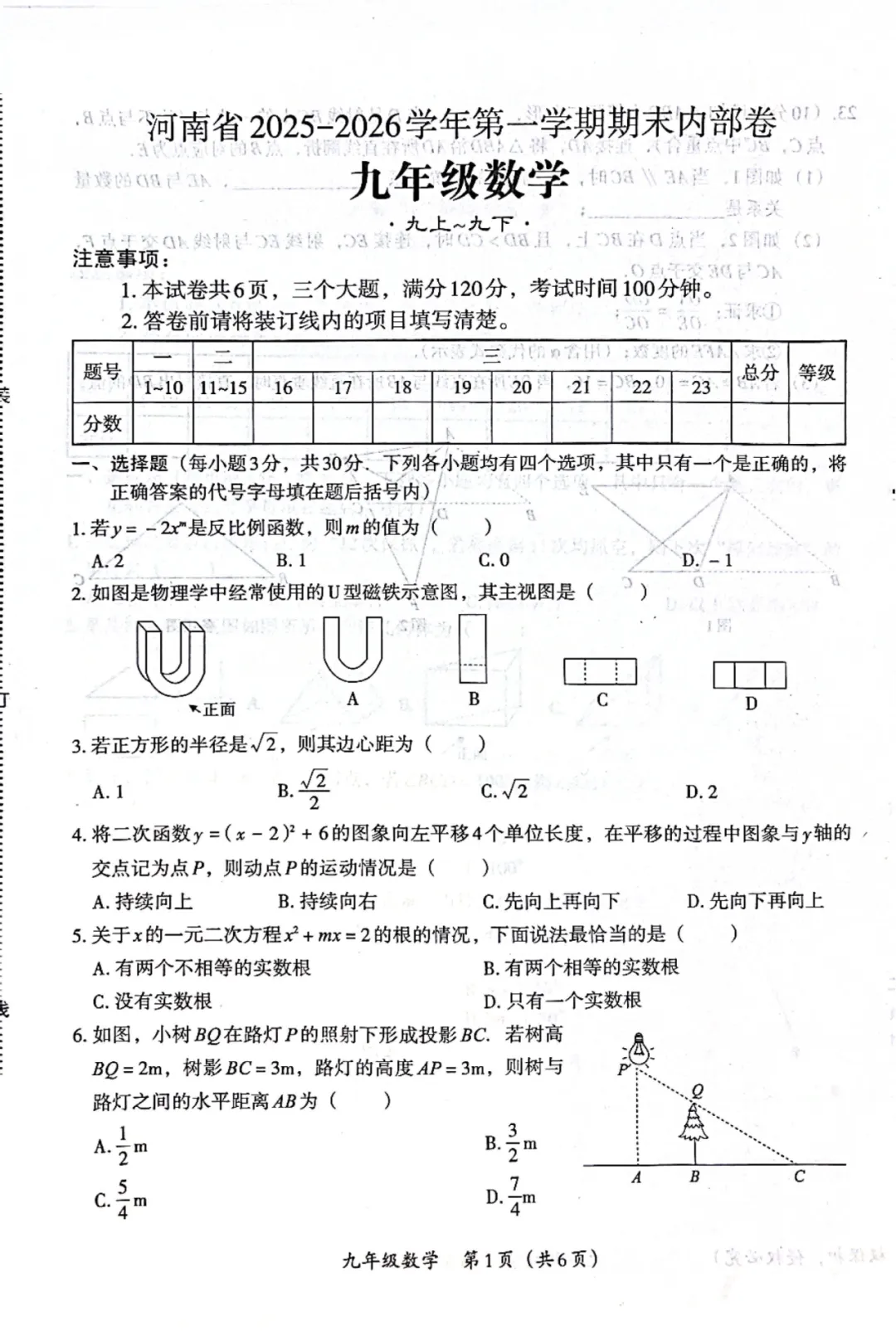 本卷作为九年级期末测试,选择题前6题的基础概念判断和填空题是主要得分点,考查学生对基本数学概念和运算的掌握;难点在于第15题的动点轨迹分析和第23题的几何变换综合,特别是第22题的圆与切线证明对学生的空间想象和逻辑推理能力形成挑战,体现了数学学科的数感、几何直观和数据分析核心素养。
