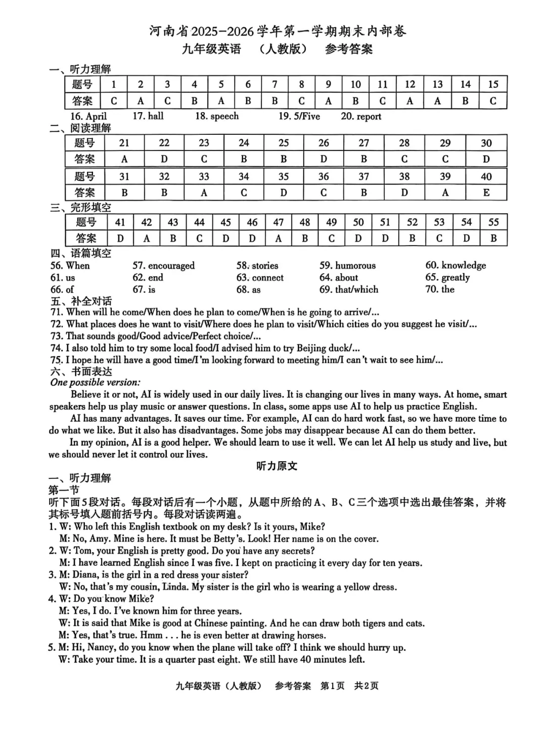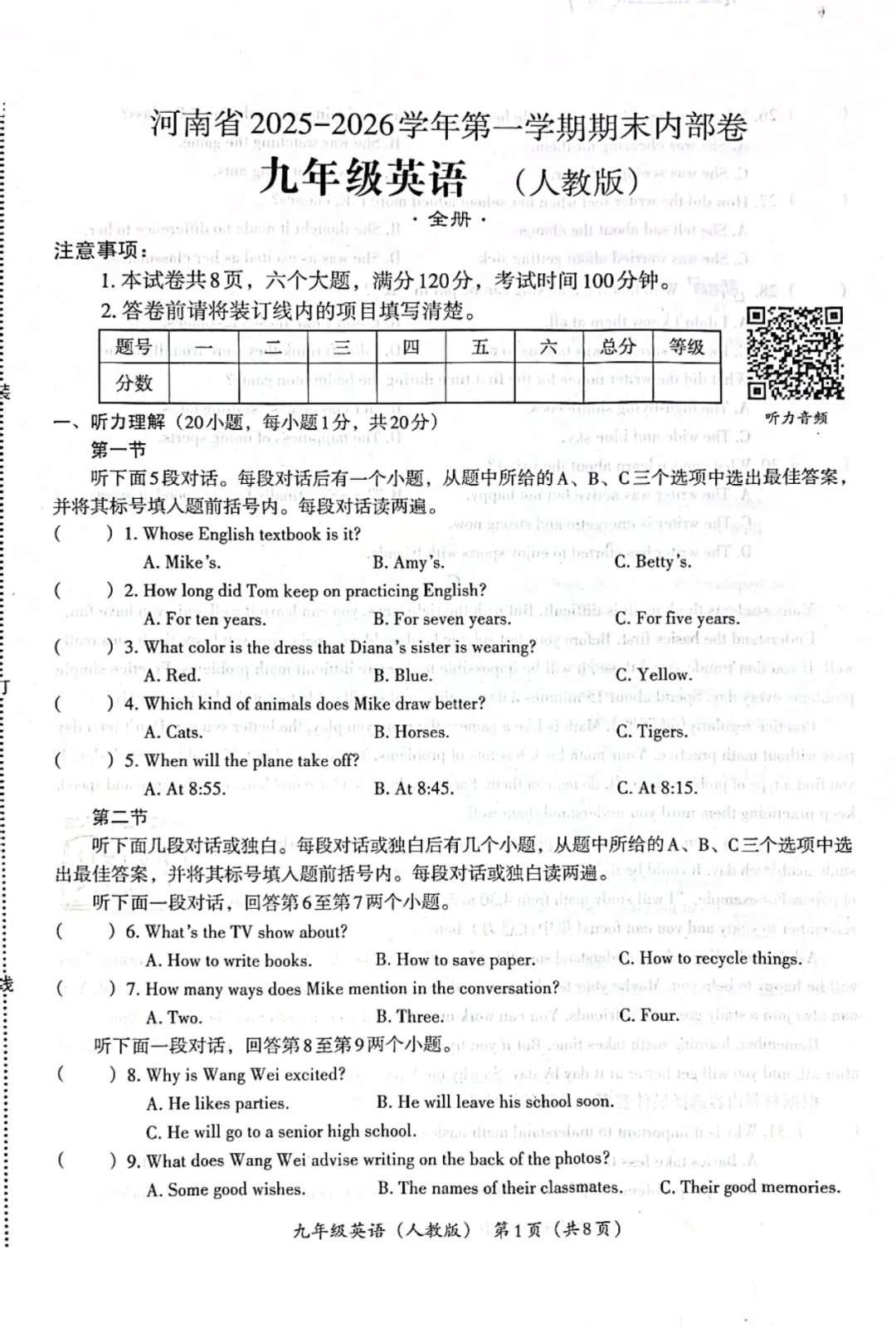 本卷作为九年级期末测试,听力部分前10题的基础信息判断和选择题是主要得分点,考查学生对基础语言知识和日常交际的掌握;难点在于完形填空的情感理解题和语篇填空的语法运用,特别是书面表达的人工智能利弊分析对学生的观点表达和逻辑组织能力形成挑战,体现了英语学科的语言能力、学习策略和文化意识核心素养。