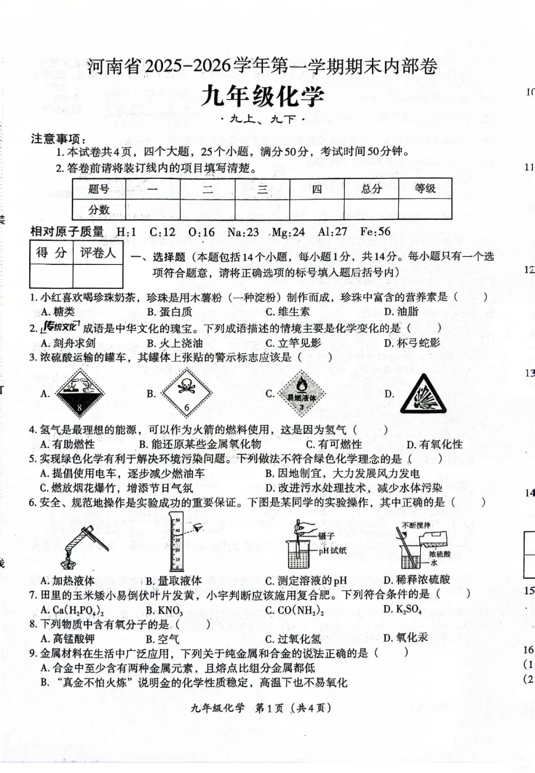 本卷作为九年级期末测试,选择题前8题的基础概念判断和填空题是主要得分点,考查学生对基本化学概念和原理的掌握;难点在于第20题的推断题和第23题的反应机理分析,特别是第25题的综合应用题对学生的知识整合和计算能力形成挑战,体现了化学学科的宏观辨识、变化观念和科学探究核心素养。