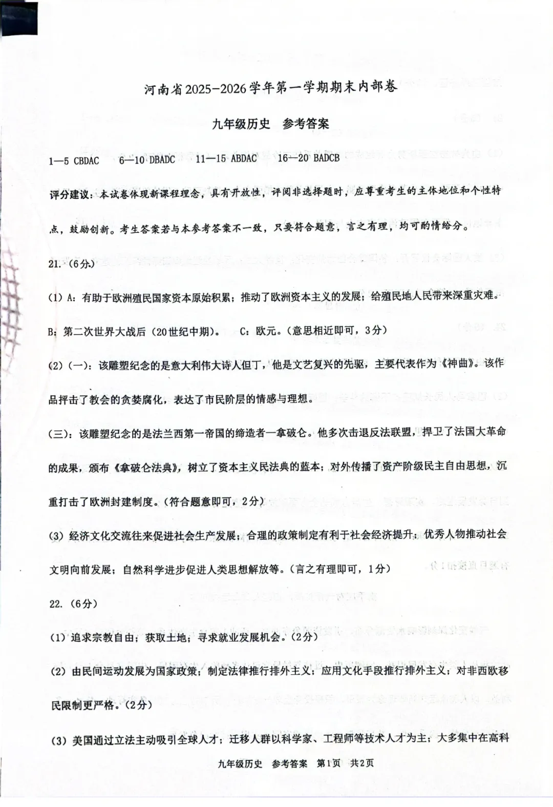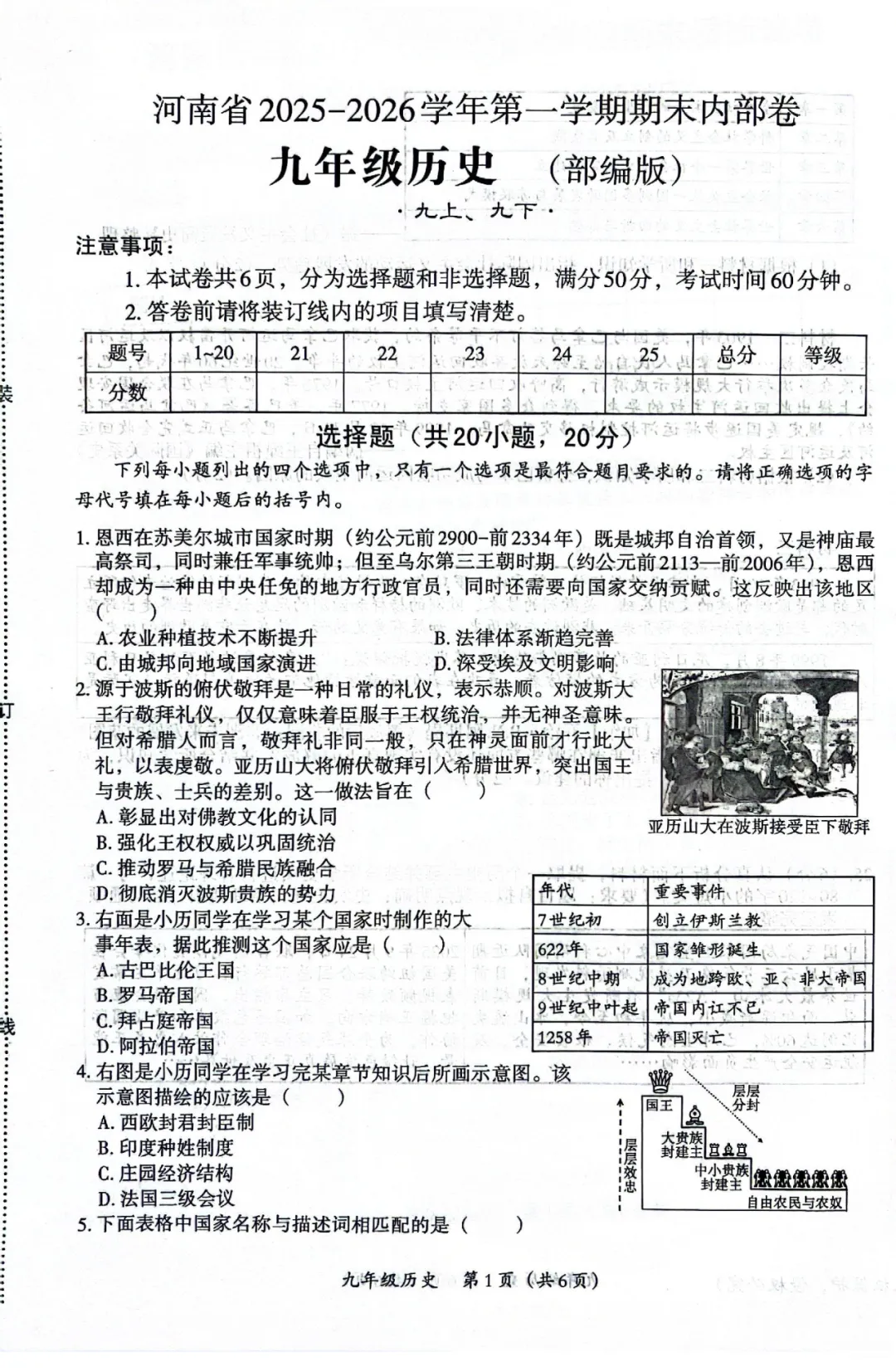 本卷作为九年级期末测试,选择题前5题的基础史实判断和填空题是主要得分点,考查学生对基本历史概念和事件的掌握;难点在于第2题的文明差异分析和第3题的大事年表推断,特别是第5题的文明特征匹配对学生的时空观念和综合理解能力形成挑战,体现了历史学科的史料实证、历史解释和家国情怀核心素养。