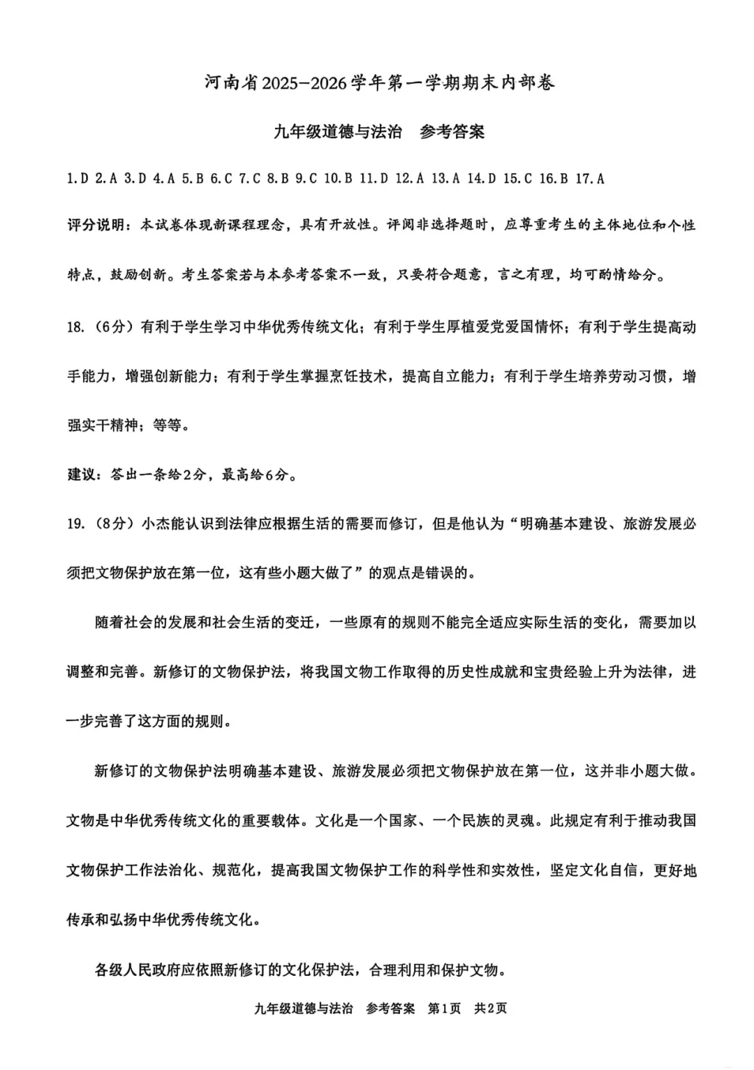 本卷作为九年级期末测试,选择题前8题的基础概念判断和填空题是主要得分点,考查学生对基本政治概念和法律常识的掌握;难点在于第9题的生态文明建设和第16题的国际合作分析,特别是第19题的文物保护法辨析对学生的价值判断和综合思辨能力形成挑战,体现了道德与法治学科的政治认同、法治意识和公共参与核心素养。