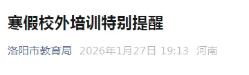 寒假临近,为深入贯彻落实国家“双减”工作部署,切实减轻学生假期作业负担和校外培训负担,守护孩子们的身心健康,让大家度过一个安全、充实、快乐、有意义的假期,洛阳市教育局就寒假期间校外培训相关事项特别提醒如下: