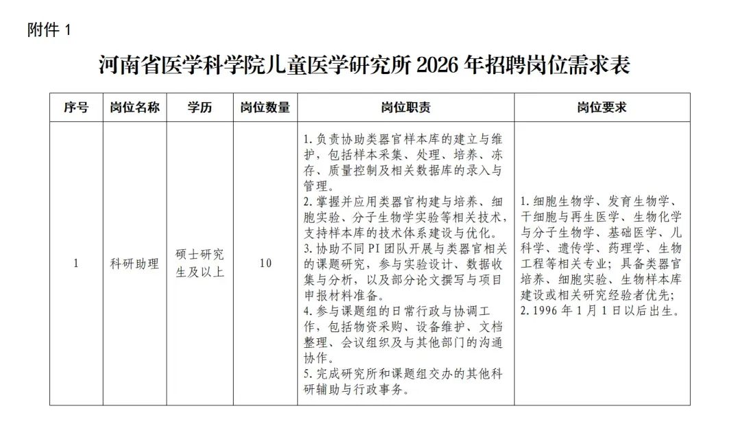 因业务发展需要,河南省医学科学院儿童医学研究所拟面向社会公开招聘科研助理人员10名。结合我所实际,制定本招聘方案。