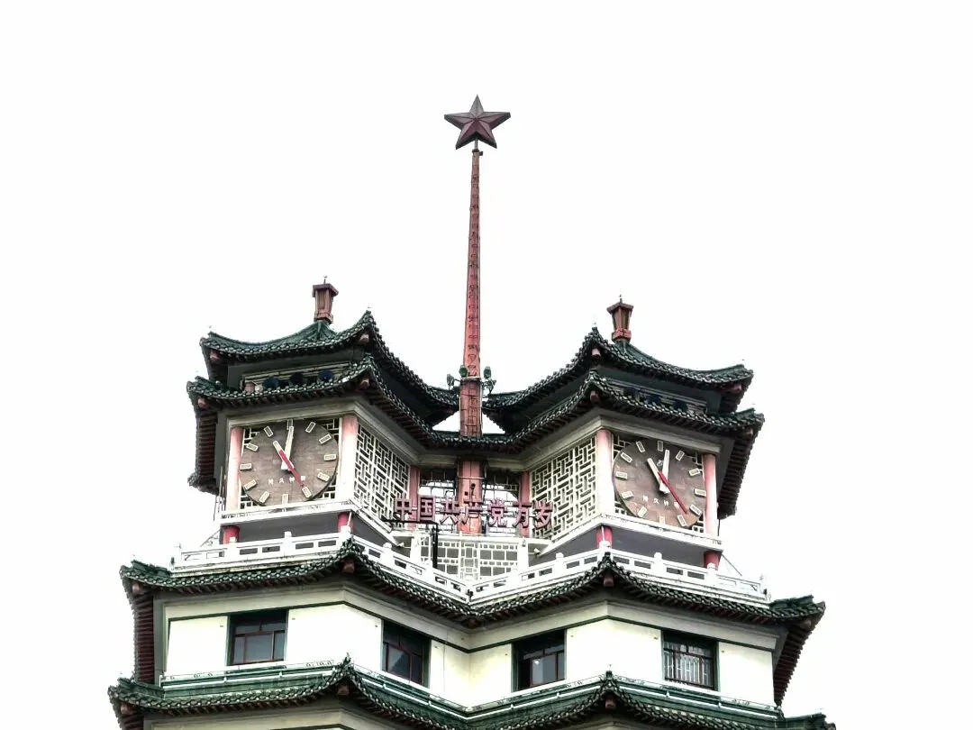 每层均有飞檐挑角,绿色琉璃瓦覆顶,外表面用白水泥、白石子粉刷,每层各面均有红漆方形格窗。塔顶为重檐方角攒夹顶,钟楼顶端矗立9米旗杆,上置红色五角星一枚,并有六面直径2.7米的大钟,