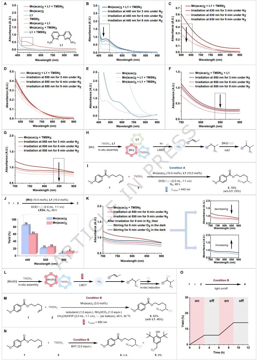 基于该组装策略,Mn(acac)₃与TMSN₃在CH₃CN/HFIP中的组合得到了吸光范围扩展至850 nm的体系;该特性进一步被利用,实现了烯烃的选择性好氧羟基叠氮化一步反应。这些发现为原位组装的3d金属基低能光化学的发展铺平了道路。