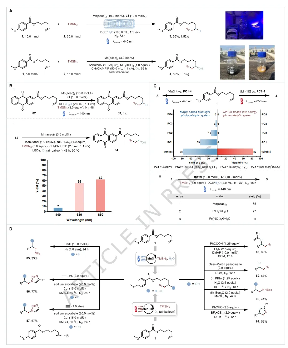 在本文中,作者证明了锰基光催化体系的原位组装是从高能可见光诱导的锰催化中快速解锁低能光氧化还原催化体系的有效策略。有价值的叠氮自由基的形成可通过低能近红外光(λ中心=850 nm)实现,而非依赖高能可见光(蓝光,λ中心=440 nm)。蓝光诱导的锰光催化体系可实现未活化烯烃以H₂O为氢源的反马氏自由基氢叠氮化反应,而锰基低能光催化平台可实现烯烃的好氧羟基叠氮化一步反应。这展示了原位组装锰基光催化的独特催化能力。