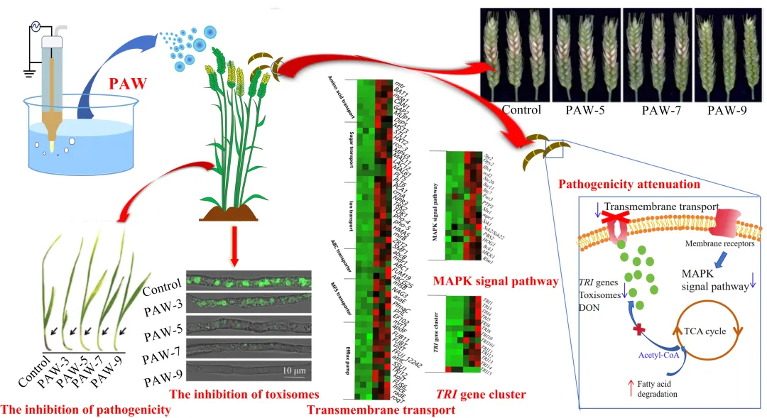 禾谷镰刀菌(Fusarium graminearum)引发的小麦赤霉病严重威胁全球小麦生产。化学农药的长期使用会导致病菌的耐药性。PAW作为一种绿色杀菌剂在农业领域展现出广泛的应用潜力。研究结果表明,PAW不仅具有快速灭活禾谷镰刀菌的能力,而且能够抑制致病力,控制病斑形成,降低脱氧雪腐镰刀菌烯醇毒素(DON)含量。PAW对致病力的抑制作用与DON生物合成、跨膜转运和MAPK信号通路有关。田间试验表明,周麦36和郑麦1860防治效果达到80%左右,DON产量分别降至6.57和1.31 μg/g。该项研究为作物保护提供了一种新型解决方案。