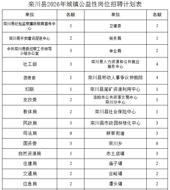栾川县2026年城镇公益性岗位招聘计划表