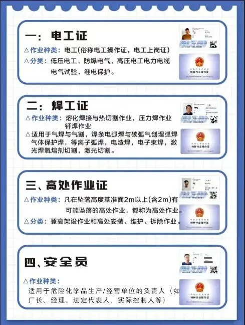 ■ 焊接与热切割作业证:俗称“焊工证”,适用于熔化焊接与热切割作业(如气焊、电焊、氩弧焊、二氧化碳保护焊等)、压力焊作业、钎焊作业。
