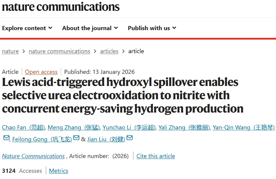 Lewis acid-triggered hydroxyl spillover enables selective urea electrooxidation to nitrite with concurrent energy-saving hydrogen production. Nat. Commun., 2026, https://doi.org/10.1038/s41467-026-68302-w.